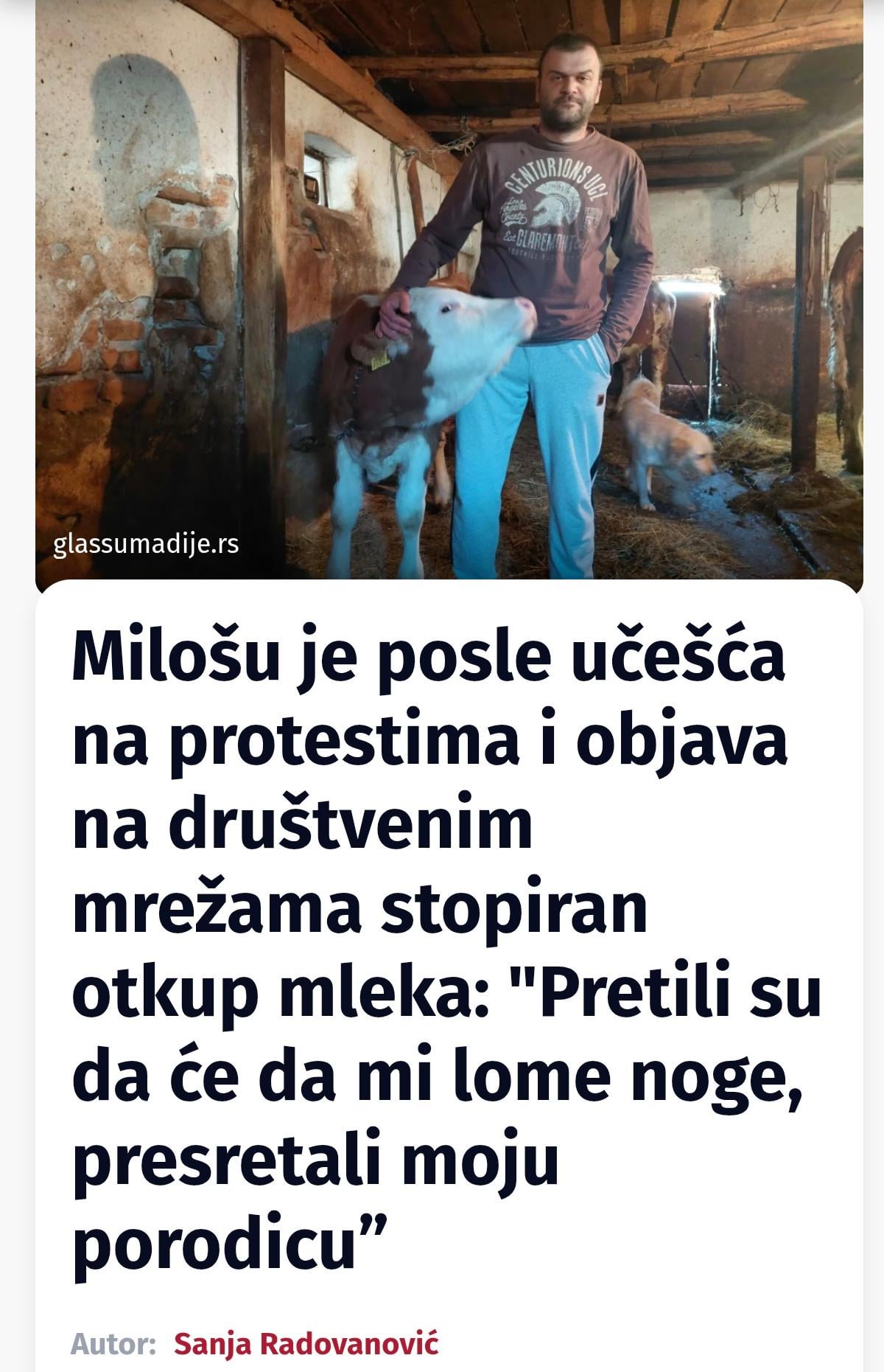 Der Landwirt und Milchbauer Miloš Sretović (35) aus dem Dorf Miločaj bei Kraljevo, Vater von vier Mädchen, blieb ohne das verlässliche Einkommen, das er jeden Monat durch den Milcheinkauf hatte, weil die Molkerei, mit der er zusammenarbeitete, den Kauf stornierte. Er vermutet, dass es etwas mit den Posts in sozialen Netzwerken zum Einkaufspreis von Milch zu tun hat, die er in den vergangenen Tagen veröffentlicht hat.