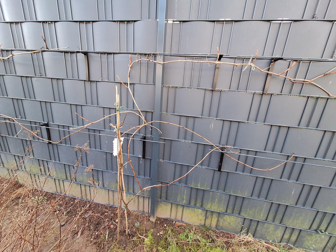 Es sind vier Reben. Drei etwa 3 Jahre alt am Zaun und links vom Rebbogen und eine deutlich kräftigere, ca. 5 Jahre alte Rebe am Bogen an einer Säule.
