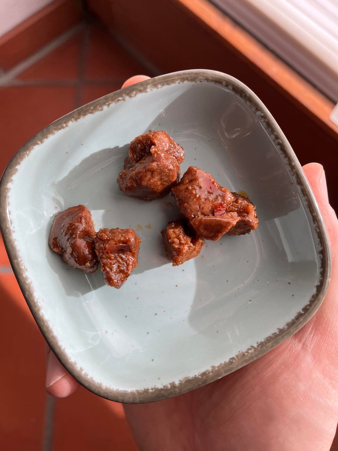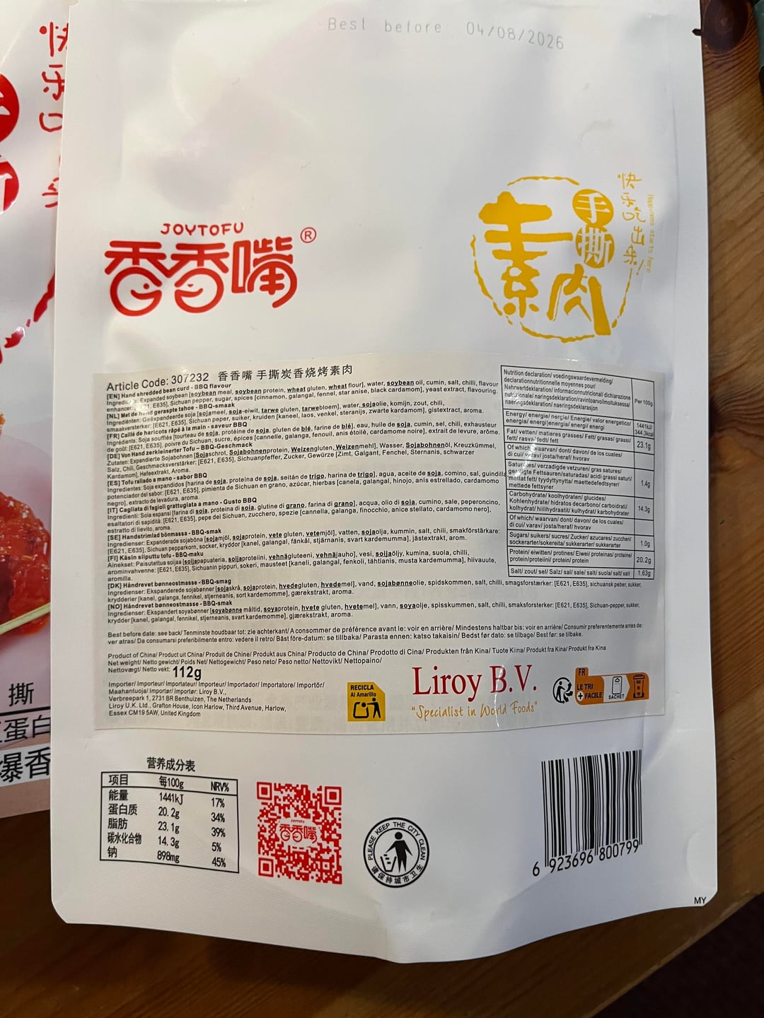 Konsistenz ist vergleichbar mit Fleisch. Der Geschmack des Tofus ist weder Fleisch noch Tofu, trotzdem sehr interessant. Sehr dürftig gesalzen, wenn man sowas wie Jerky erwartet. Der Geschmack (Spicy/BBQ) ist sehr schwach, schmeckt eher stark fettig.