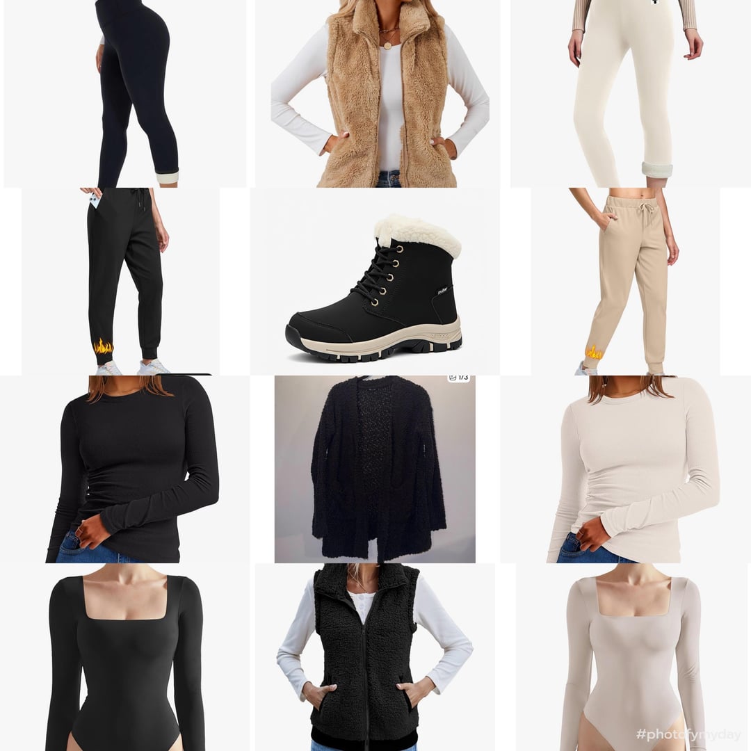 Either way, most of the important things you already have: puffy coat, boots, and thermal leggings. Instead of several vests, I would (personally) prioritize sweaters, especially wool sweaters. Also, I could be wrong, but the pants in your photos do not look warm at all.