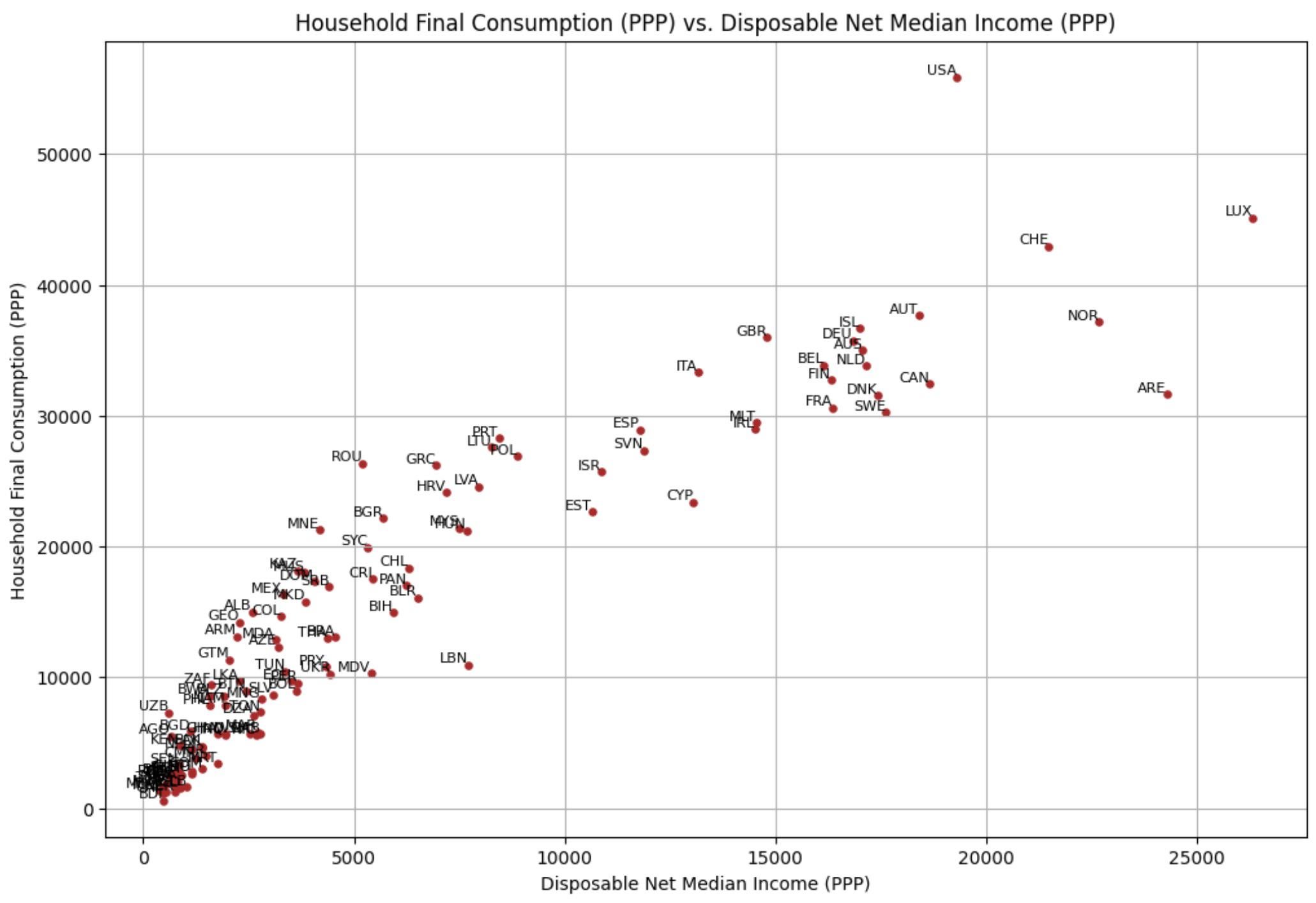 Endverbrauch der privaten Haushalte (KKP) im Vergleich zum verfügbaren Medianeinkommen (KKP)