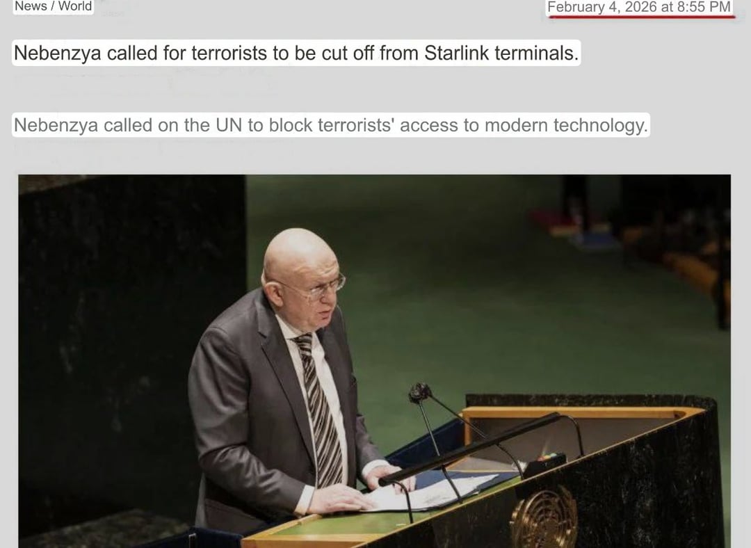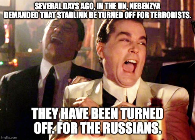 Vor einigen Tagen forderte Nebenzya bei den Vereinten Nationen, Starlink für Terroristen abzuschalten. Seine Bitte wurde gehört und Starlink wurde abgeschaltet. Für russische Terroristen. Eigentlich meinte er ISIS, aber wenn der Schuh passt…