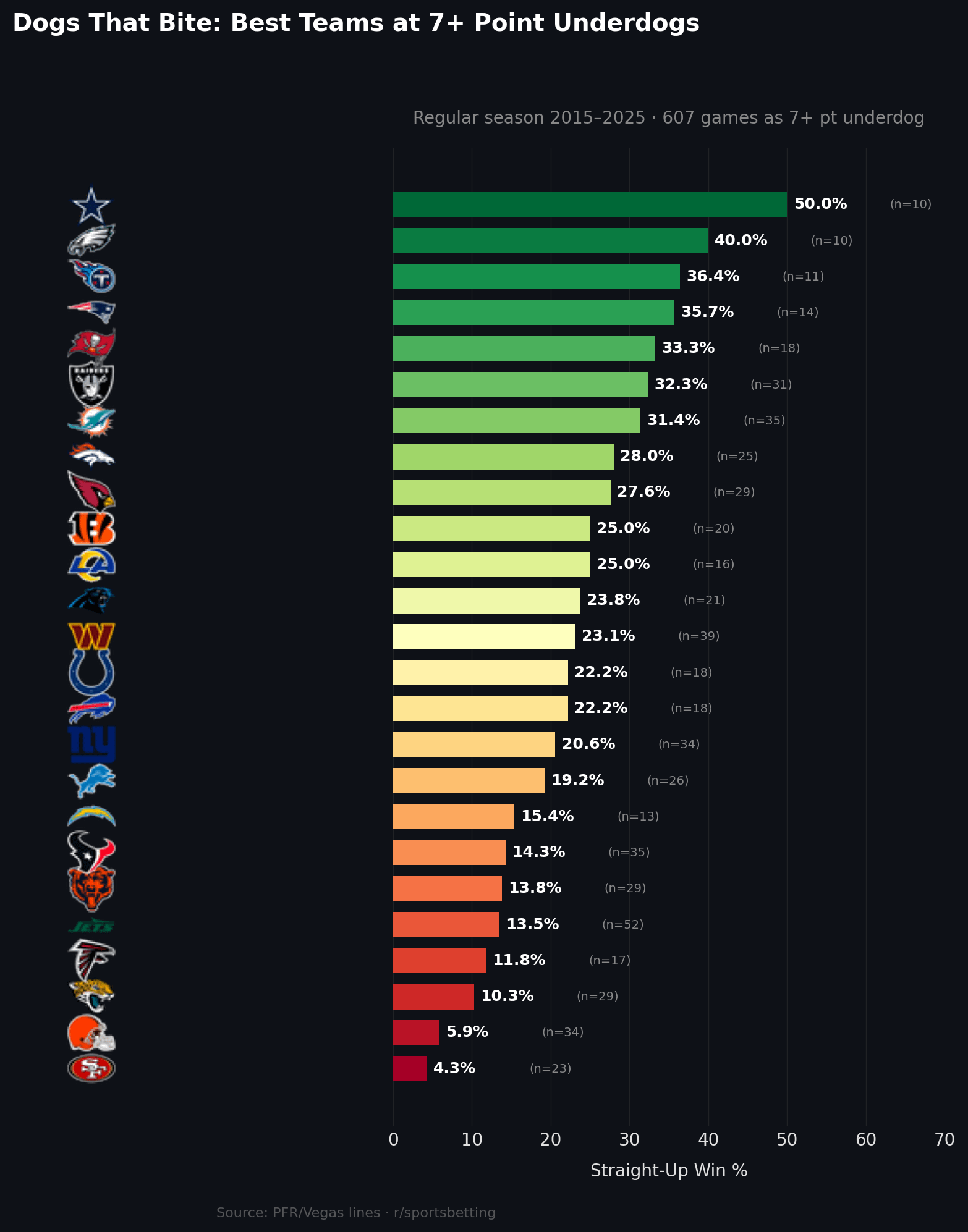 – Filtered regular-season games where teams closed as 7+ point underdogs