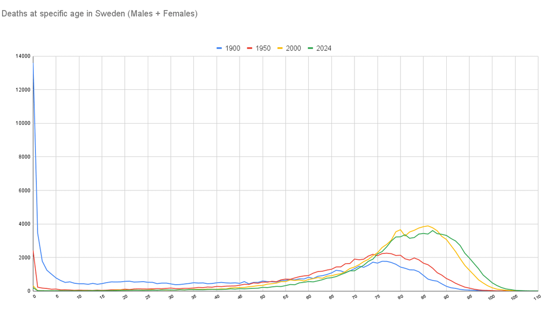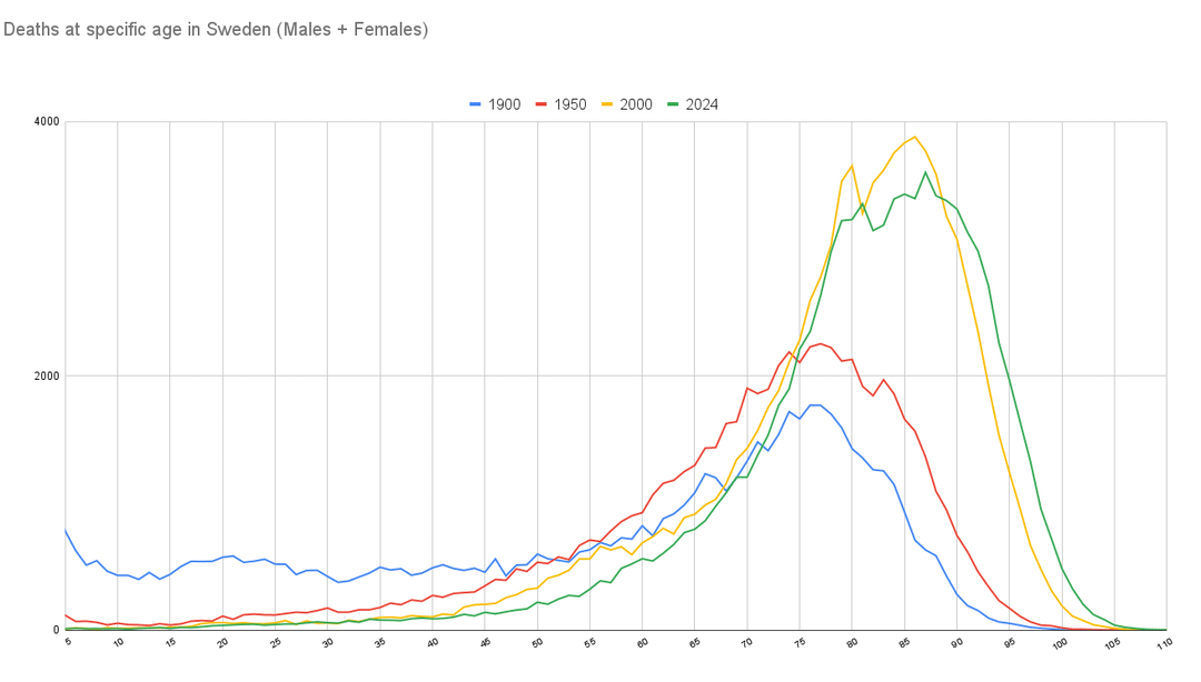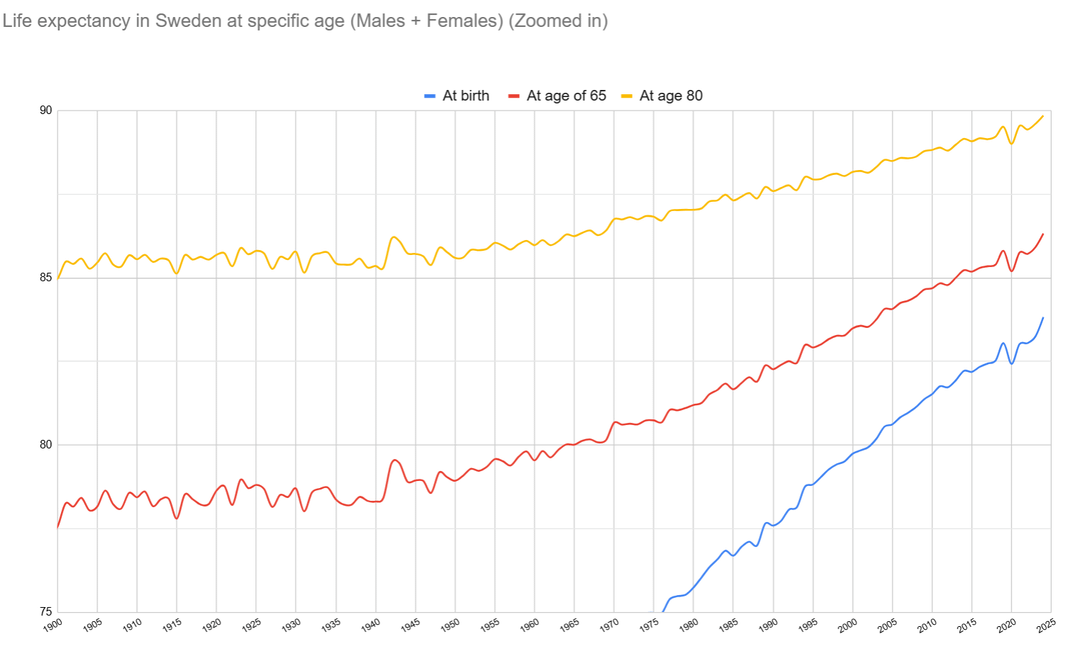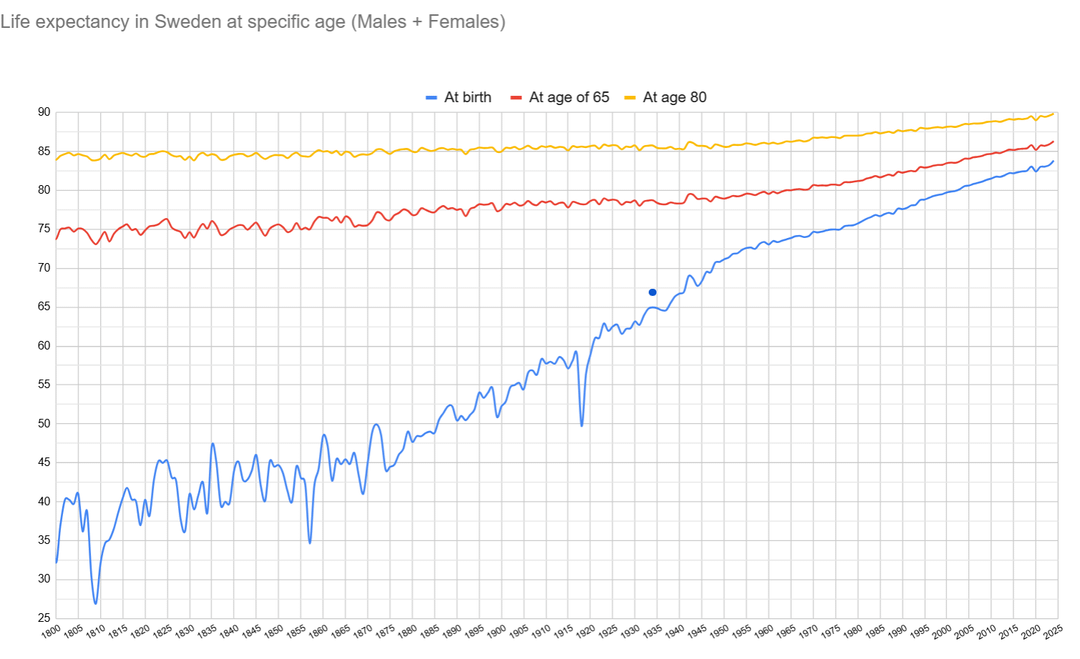 Aufgrund robuster und langer Daten zu Todesfällen und Geburten in Schweden können wir sehen, wie sich LE im Laufe der Zeit verändert hat. Es zeigt, dass wir erst seit etwa 1875 damit begonnen haben, die Lebenserwartung in Schweden rapide zu erhöhen. Dieses Wachstum hörte um 1945 plötzlich auf. Was verursachte diesen Anstieg? Viele Aspekte wie die bahnbrechende neue Praxis von Ignaz Semmelweis und die späteren ersten Antibiotika und Impfstoffe verhinderten tatsächlich viele Todesfälle bei Neugeborenen. Dieses Bild ist jedoch genau der Grund, warum manche Leute behaupten, dass wir nicht länger leben können als zuvor. Das ist nicht korrekt.