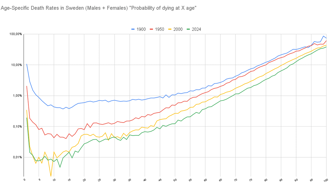 Dies ist wahrscheinlich die drittbeliebteste Grafik. Es zeigt die logarithmische Sterbewahrscheinlichkeit. Wissenschaftler haben vor Jahrzehnten herausgefunden, dass sich die Wahrscheinlichkeit, zu sterben, etwa alle sieben bis acht Jahre verdoppelt, unabhängig von Geschlecht, Land, Alter und Zeitpunkt der Datenerhebung. Aufgrund der exponentiellen Natur des gesamten Todesaspekts verrät uns diese Grafik und ihre Veränderungen viel darüber, welche Altersgruppen am meisten davon profitieren. Interessanter Artikel zu diesem Thema.