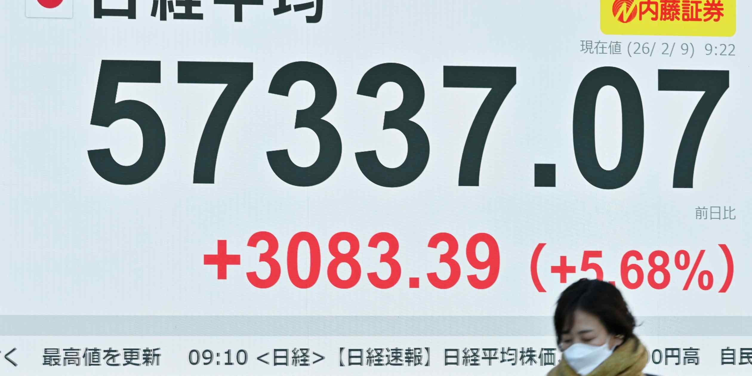Der Benchmark Nikkei Stock Average sprang um über 3.000 Punkte oder 5,7 % und übertraf zeitweise das Rekordschlusshoch von 54.720,66, das er am 3. Februar markiert hatte. Der breiter gefasste Tokyo Stock Price Index (Topix) stieg um 2,6 % auf ein neues Intraday-Hoch, während die Futures um über 6 % zulegten.