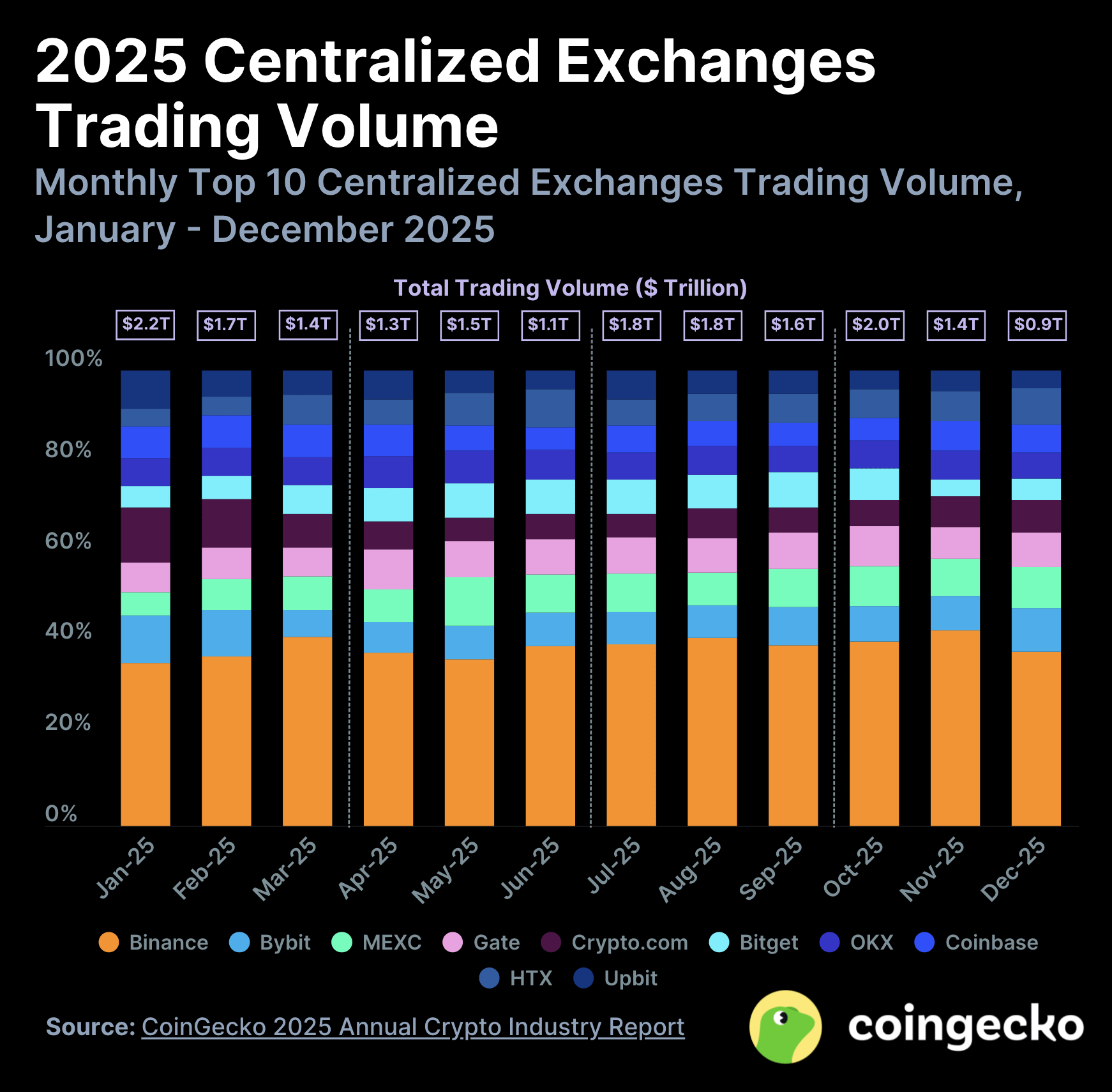 Binance war Marktführer unter den zentralisierten Börsen mit einem Anteil von 38,3 % am gesamten Spot-Handelsvolumen im Dezember 2025. Bybit war gemessen am Spot-Handelsvolumen die zweitgrößte zentralisierte Börse. Es brachte ein Volumen von 90,0 Milliarden US-Dollar ein, mit einem Marktanteil von 9,5 %. MEXC war die drittgrößte zentralisierte Börse mit einem Spothandelsvolumen von 86,0 Milliarden US-Dollar und einem Marktanteil von 9,1 %. Mit einem Wachstum von +90,9 % gegenüber dem Vorjahr war sie auch die am schnellsten wachsende Börse im Jahr 2025.