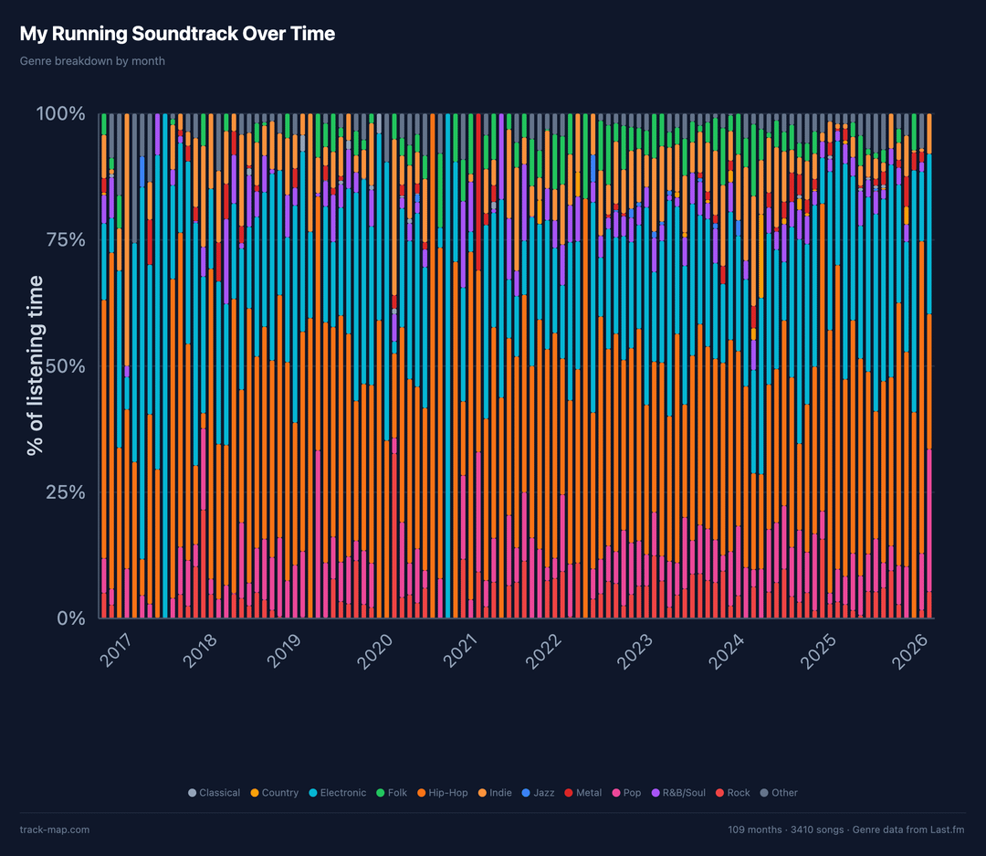 * **That genre mix has stayed remarkably consistent over 9 years** of running (109 months, 3,410 songs)