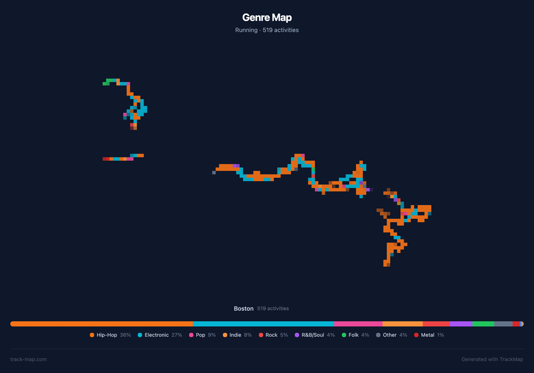 The „Genre Map“ (first image) divides my running routes into a grid where each cell is colored by the dominant genre listened to in that area. Opacity scales logarithmically based on how many runs passed through each cell. The map shown is Boston, where the majority of my runs took place. You can see the hip-hop orange and electronic teal trading off across different routes.
