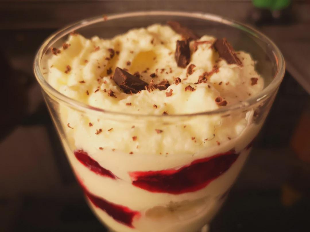 Mascarpone und Sahne und Puderzucker aufschlagen Schichtweise in die Gläser füllen und Kirschen und Banane dazwischen einfügen.. Dunkle Schokolade reiben und die Krümmel als Toping oben auf geben. Lecker