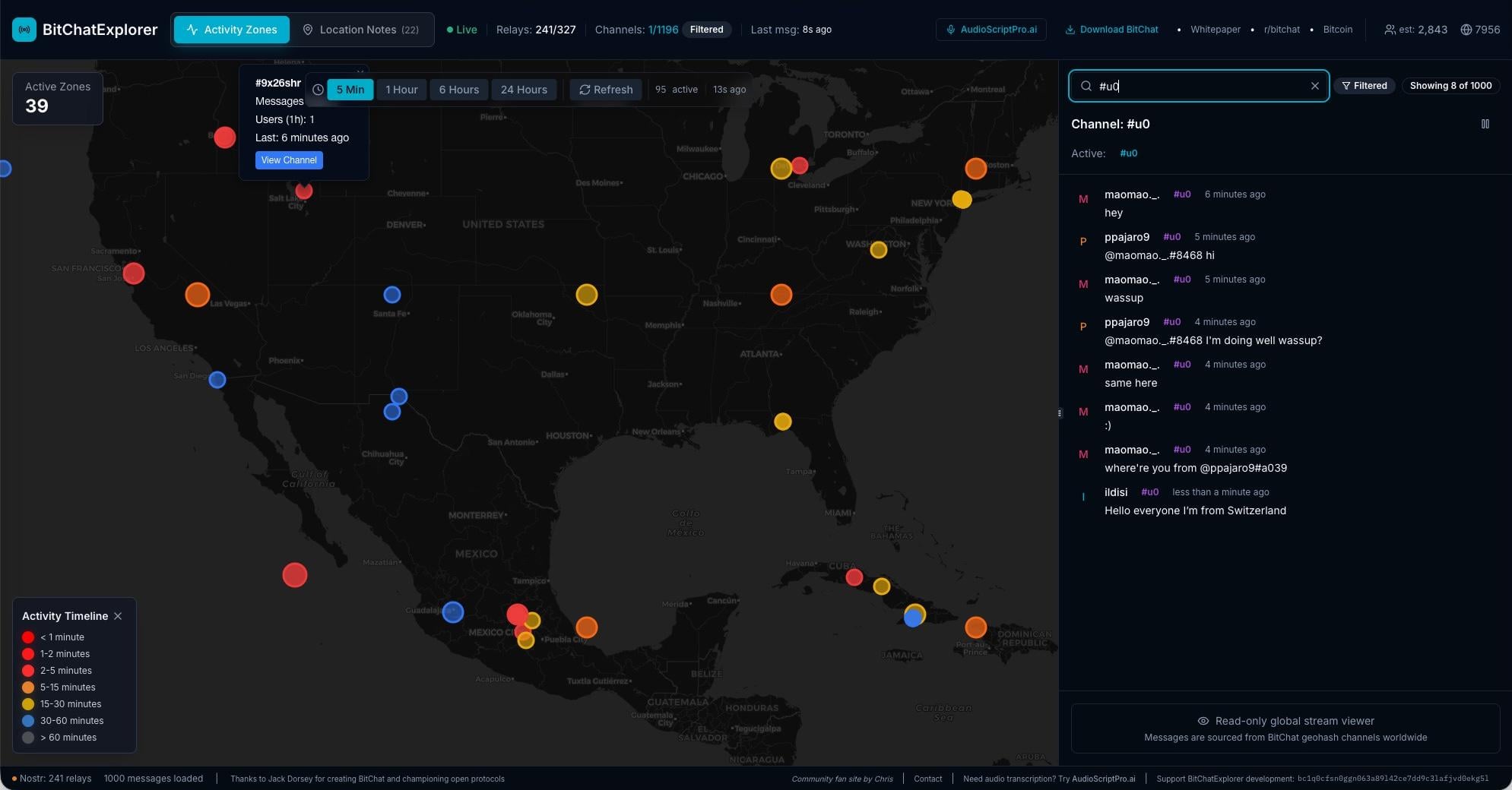 Um diesen wichtigen Unterschied zwischen der lokalen Nutzung und der Internetnutzung von Bitchat besser zu verstehen, können Sie eine der öffentlichen Karten der Benutzer konsultieren, beispielsweise die, die in Echtzeit aktualisierter Form verfügbar ist unter Bitchatexplorer.com. Dort können Sie Benutzer sehen, die Bitchat für die Fernkommunikation verwenden, und Sie können ihre öffentlichen Gespräche lesen.