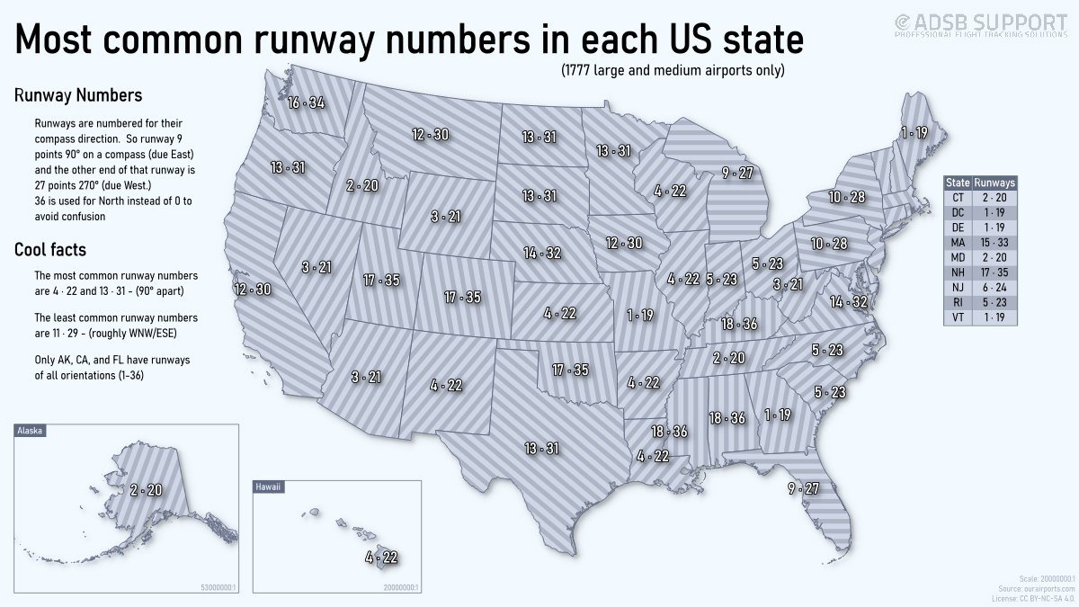 Dies ist eine von mir erstellte Visualisierung, die alle großen Flughafenlandebahnen in den Vereinigten Staaten betrachtet und die in jedem Bundesstaat am häufigsten vorkommende Ausrichtung zeigt. Dies war für mich eine Selbsttrainingsübung zur Verbesserung, daher ermutige ich Sie, mir konstruktive Kritik zu geben, wie es verbessert werden könnte.