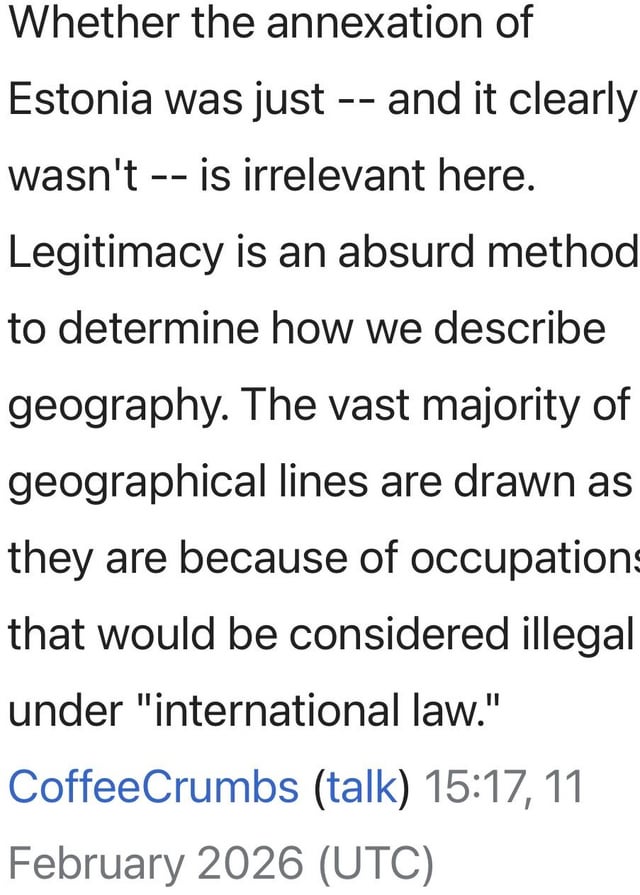 Diese russischen Propagandisten erfinden in ihrem Kopf Dinge, um die Verzerrung der estnischen Geschichte zu rechtfertigen. Sie wagen sogar zu behaupten, dass „Legitimität eine absurde Methode ist, Geographie zu beschreiben“. Das meint Wikipedia mit „Neutralität“