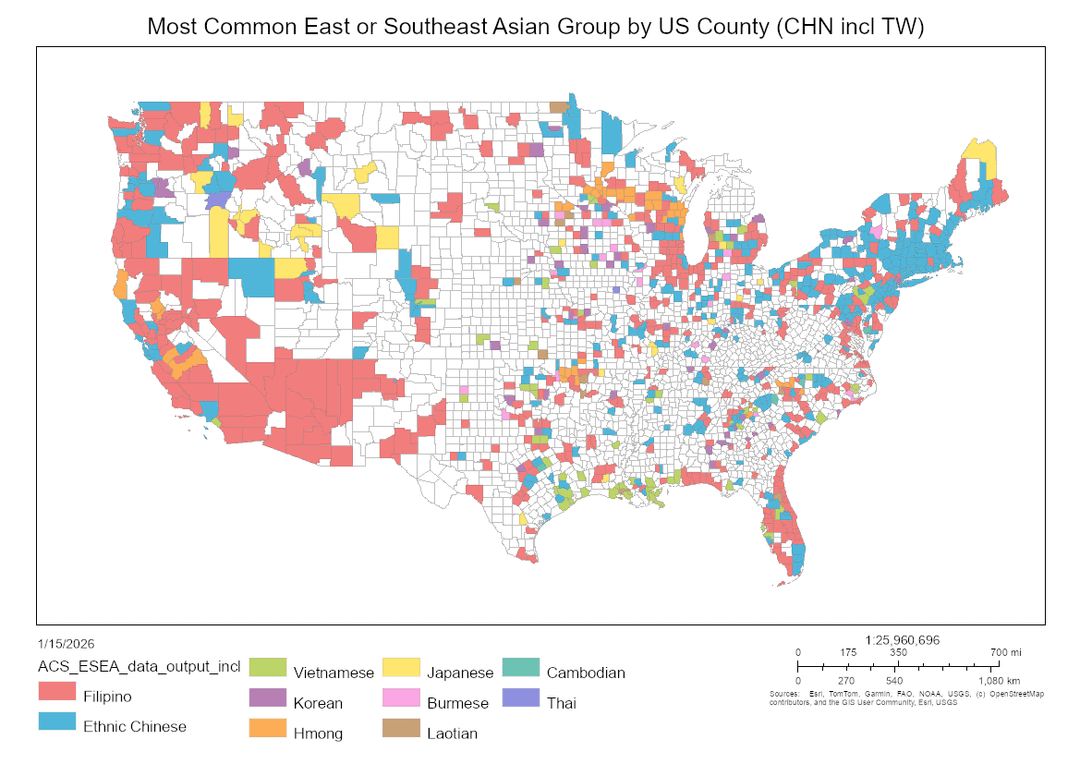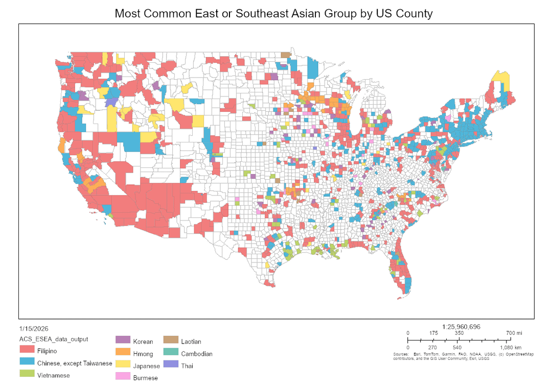 Ich habe eine modifizierte Version davon erstellt u/VineMappers Karten asiatischer Ethnien in den USA, auf denen ich Ostasien und Südostasien in einer Kategorie zusammengefasst habe. Aus irgendeinem Grund werden Hmong dazu gezählt "Ostasiatisch" im ACS-Datensatz, obwohl die meisten Hmong-Amerikaner aus Laos in Südostasien hierher kamen. Ich habe genau die gleichen Datenquellen verwendet wie in ihren Beiträgen im Jahr 2025 r/MapPorn– die 5-Jahres-ACS-Schätzungen ab 2023.