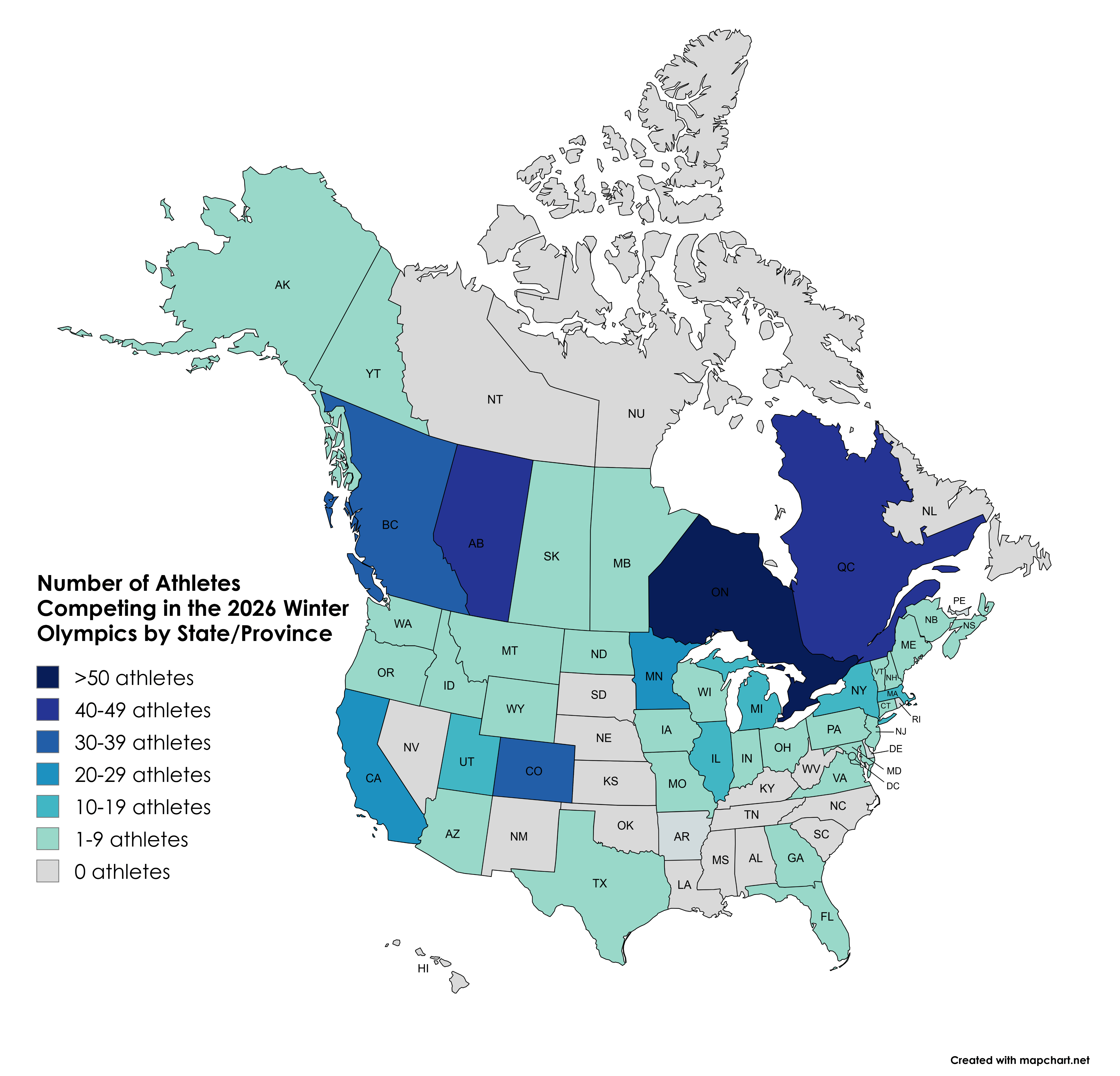 With the 2026 Milano Cortina Winter Games in full swing, here’s a breakdown of where competing athletes from the US and Canada (the top 2 countries in terms of total participants) are actually from in terms of state/province.