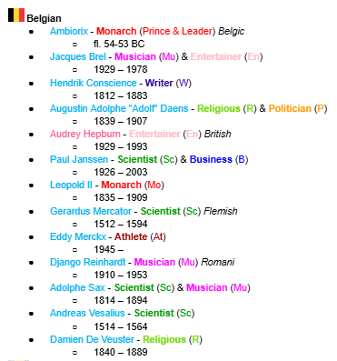 Ich möchte in Zukunft eine Geschichte mit Charakteren schreiben, die auf den einflussreichsten Menschen aus verschiedenen Ländern im Laufe ihrer Geschichte basieren, und hoffe, dass einige andere Geschichtsfreaks hier bei Belgien helfen könnten. Jeder, der innerhalb der heutigen Grenze Belgiens geboren wurde, zählt, denn wenn er heute geboren würde, würde er als Belgier eingestuft werden und nur den Hinweis erhalten, warum er berühmt ist! Ich habe eine Reihe von Kategorien, sodass jeder, den Sie nennen können, dies tut! Außerdem spreche ich kein Französisch oder welche Sprache auch immer Sie sprechen, lol, also werde ich einen Übersetzer verwenden, um mit jedem zu sprechen, der möchte, was ich sehr gerne tun würde!