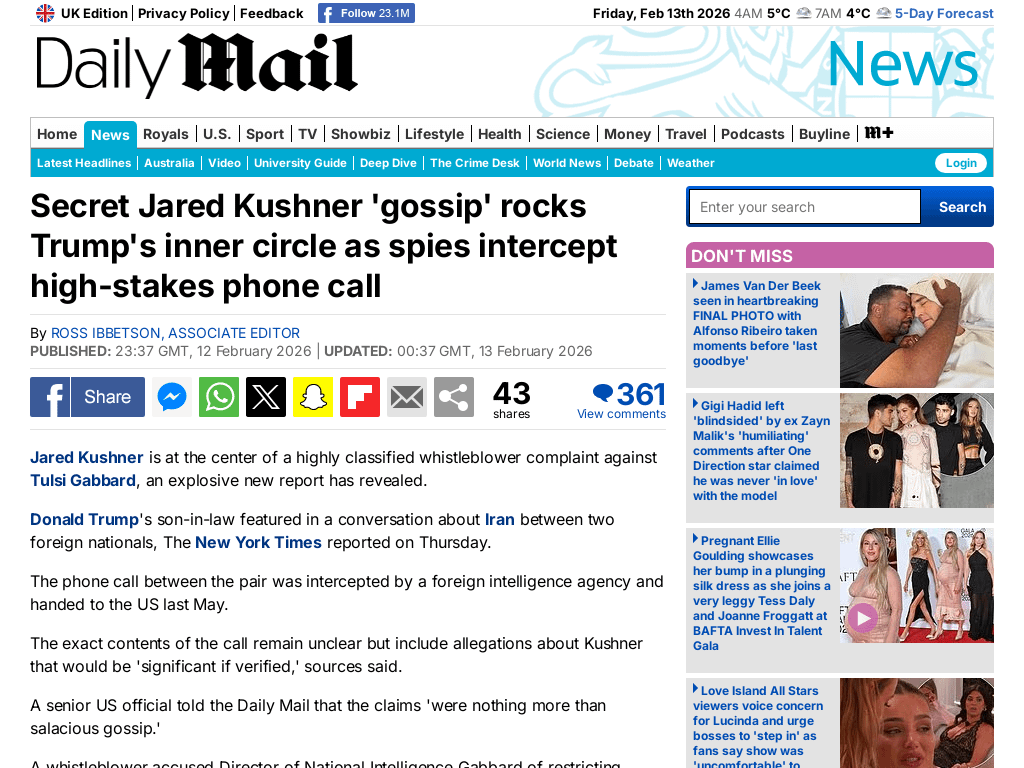 Der geheime „Klatsch“ von Jared Kushner erschüttert Trumps inneren Kreis, als Spione einen hochriskanten Anruf abfangen