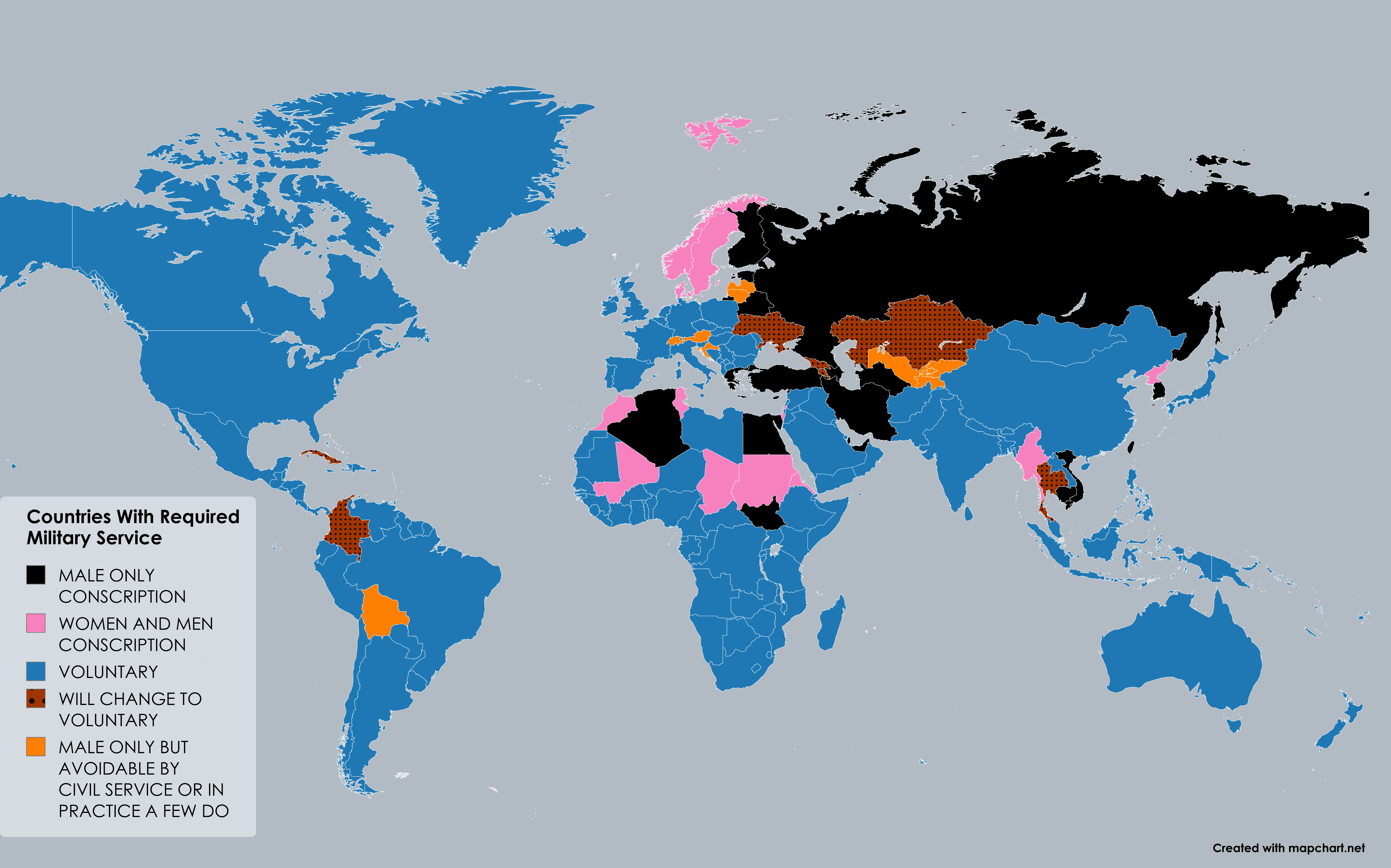 Brazil is „voluntary“, but every man is required to enlist at 18 years old, and if not enough people in your city/region volunteer to serve in the army, you can be drafted, it sucks and is the dread of any guy under 18, my dad was one of the unlucky ones back in the 80s