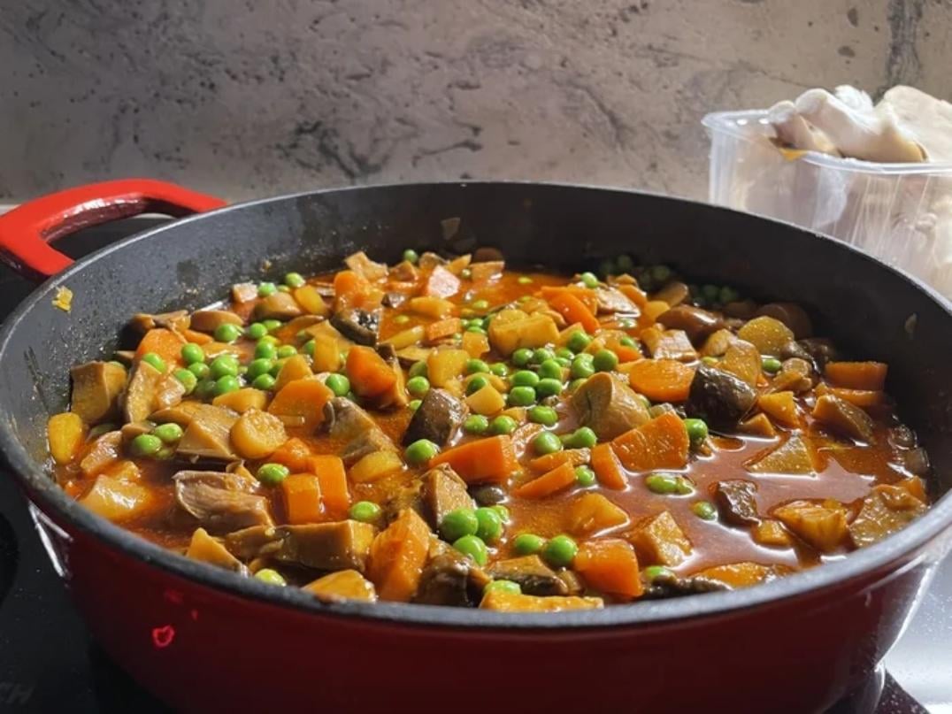 Anschließend den Deckel auflegen und alles schmoren lassen, bis das Gemüse weich ist. Zum Schluss die Erbsen dazugeben und nach ein paar Minuten das Mehl zum Andicken einrühren. Gut umrühren.