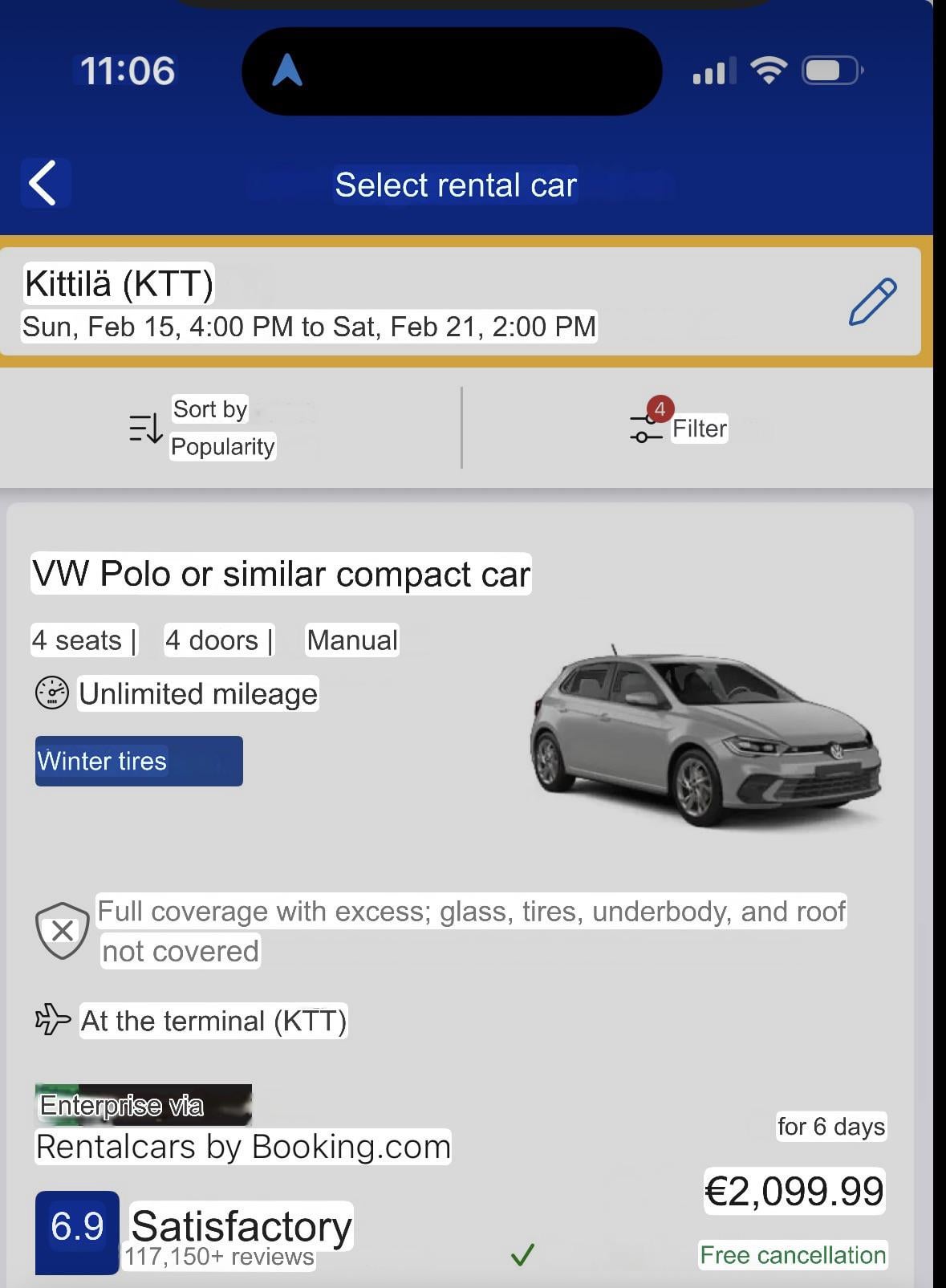 Ich werde morgen mit meiner Frau und einem Freund nach Kittilä reisen. Meine Mietwagenbuchung wurde gerade von Europcar storniert und ich kann es mir bei den aktuell verfügbaren Angeboten einfach nicht leisten, > 2.000 € für einen Miet-VW Polo für 6 Tage zu zahlen.