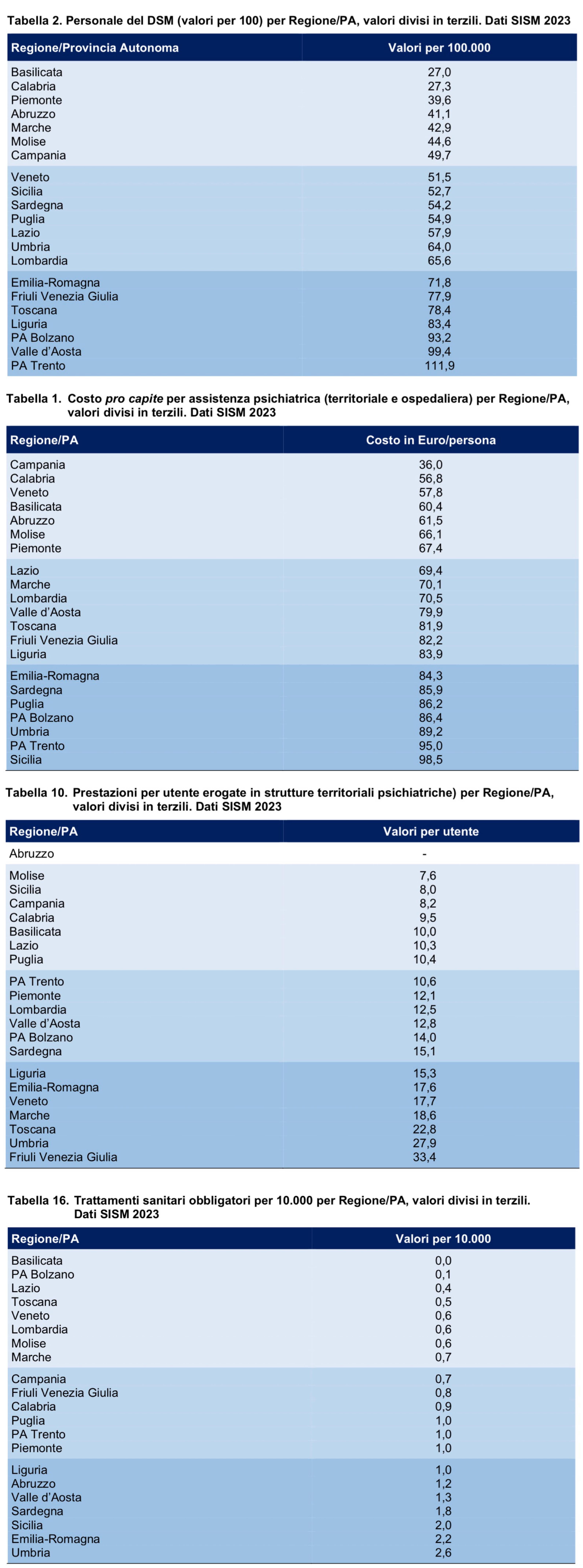 Hinsichtlich die Verfügbarkeit von Betten, Der bundesweite Trend der Entlassungen von Nutzern aus psychiatrischen Abteilungen ist seit 2020 rückläufig (in den letzten beiden Jahren: -14 % im Vergleich zu 2015-2019). Darüber hinaus weisen die südlichen Regionen, Sardinien und die zentralen Regionen im Zeitverlauf niedrigere Werte auf als die nördlichen Regionen (außer Friaul-Julisch Venetien).