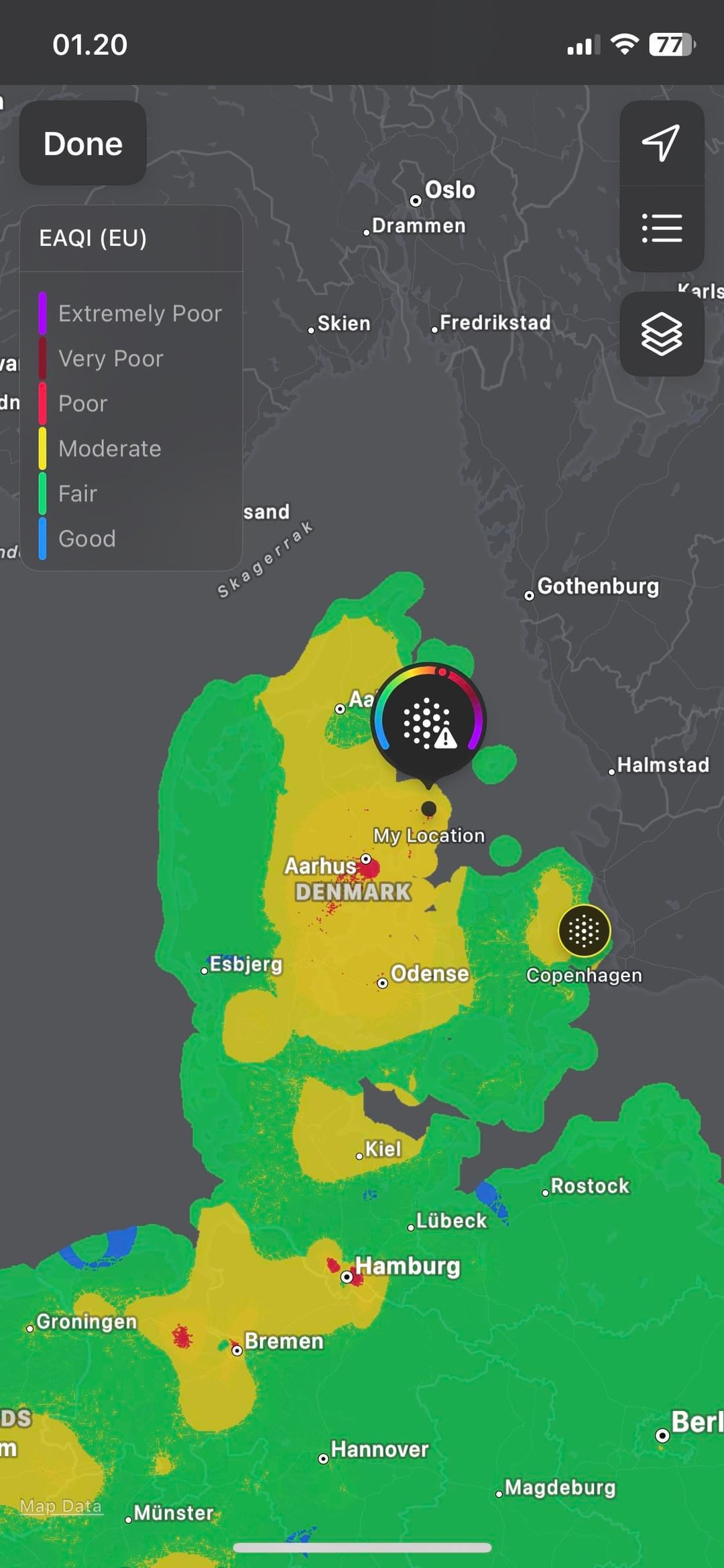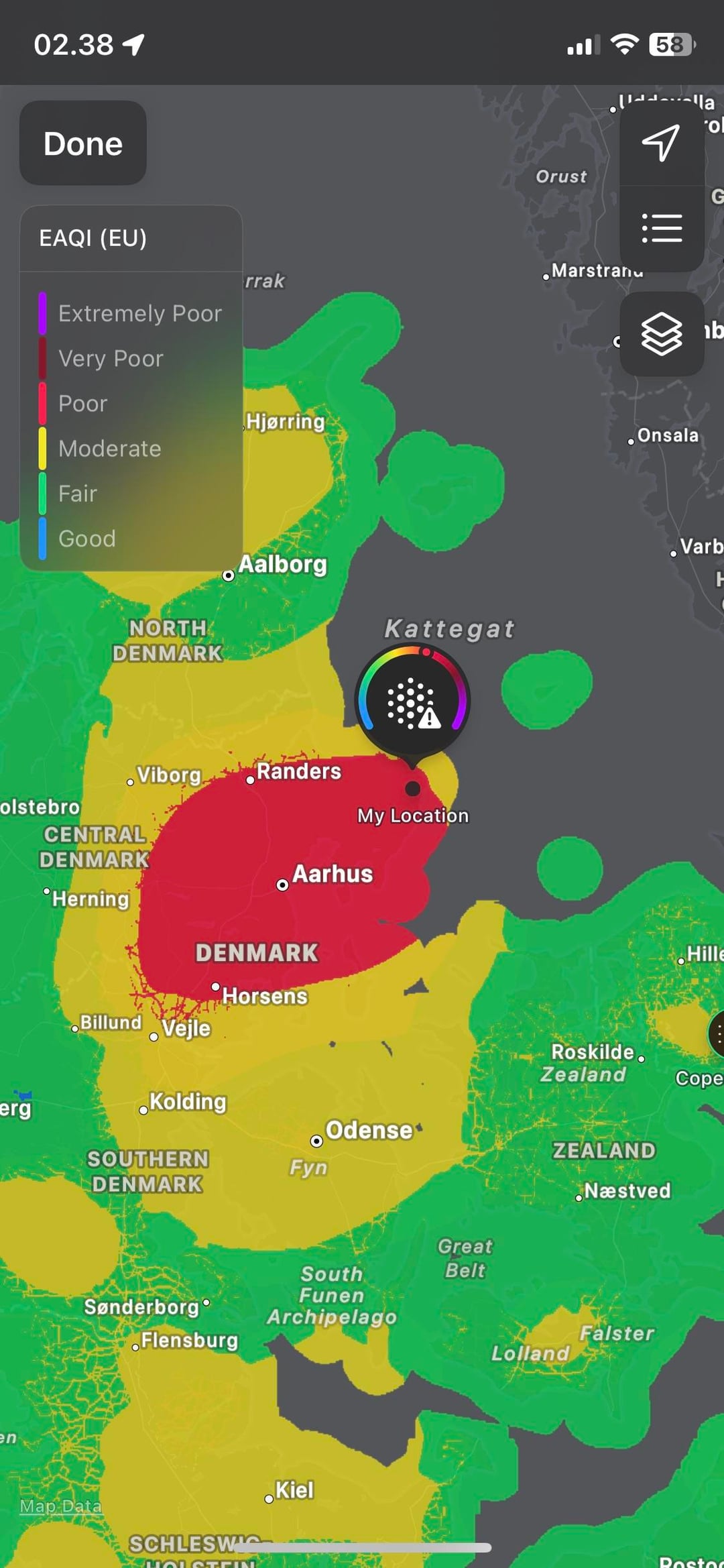 Ich habe die Wetter-App aufgerufen, um das Wetter zu überprüfen, und da stand nur „Schlechte Luftqualität“ oder so etwas in der Art und es hat sich ausgebreitet. Ich habe vor einer Stunde nachgeschaut oder so etwas in der Art und es sah schlecht aus, aber immer noch nicht so.