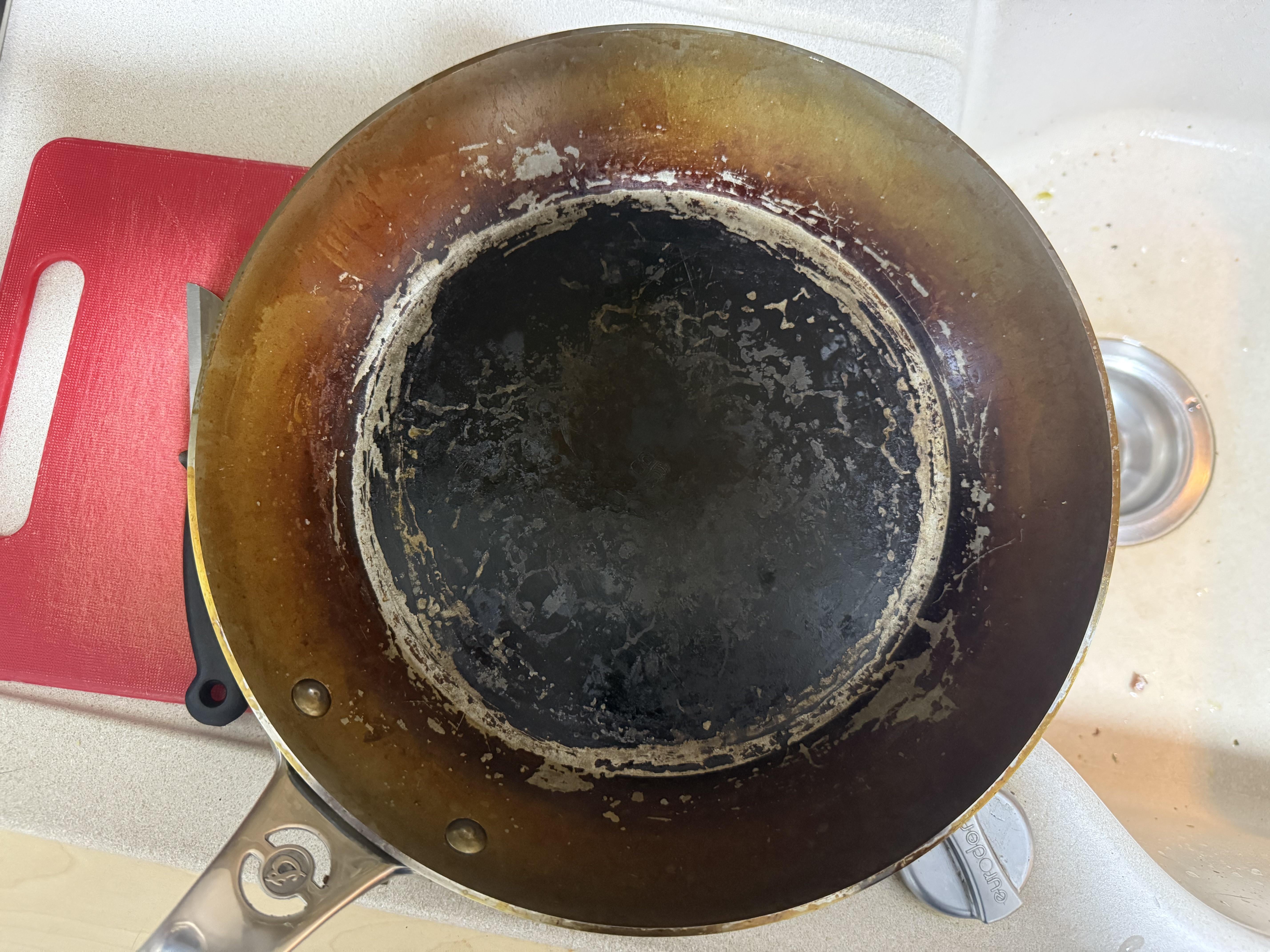 Das sieht mir doch eher nach einer Stahlguss-Pfanne aus. Die muss man nicht einbrennen. Wenn ich recht habe kannst du die jetzt mit einem Stahlschwamm und „Pink Stuff“ ordentlich und mehrmals schruppen.