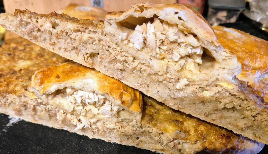 7. Den Hefeteig dritteln und dünn ausrollen. Jedes Drittel mit einem Drittel des Hähnchenfleisches füllen und runde oder längliche Teigtaschen formen. Diese in einem Dreieck angeordnet auf den Fladen setzen und mit dem restlichen Ei bestreichen.