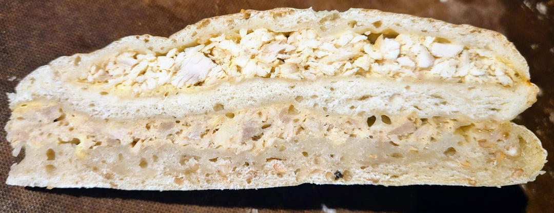 Es gibt einige dieser Fladen-Rezepte im Buch. Dieser (und ein weiteres) zeichnet sich durch Basteln/Wasteln aus. Herauszufinden was diese sind war gar nicht so einfach. Falls jemand mehr weiß, wäre ich sehr interessiert! Ich habe nur gefunden das es Gebäck aus feinem Mehl ist und hier offensichtlich mit Hähnchen gefüllt. Diese "Teigtaschen" habe ich dann roh auf das Fleisch gelegt. Das hat recht gut geklappt und ich kann mir nicht so recht vorstellen, dass damals gebackene Basteln auf den ungebackenen Fladen gegeben wurden. Aber wer weiß..