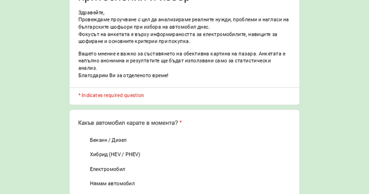 Wir führen eine kurze anonyme Umfrage darüber durch, wie die Menschen in Bulgarien Elektroautos wahrnehmen und wie sie eine Entscheidung bei der Wahl eines Autos treffen.