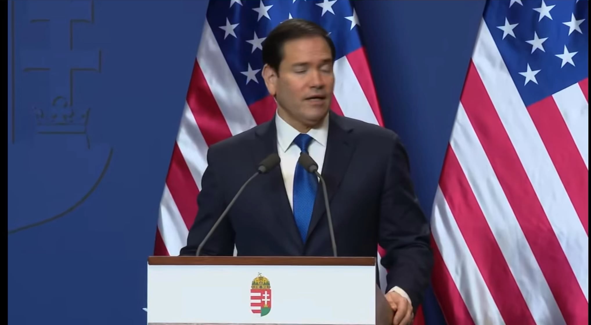 Már bocs, de a diplomácia látogatáskor nem kellene kicserélni a felszólaló pulpitusa elején az ország / nemzet címerét??? Ha már annyira adnak a látványra a dagadték?
