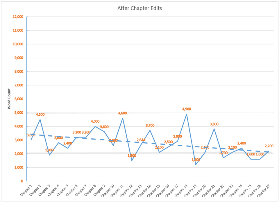Außerdem wollte ich, dass die Kapitel gegen Ende des Buches kürzer sind, damit das Buch schneller liest, wenn es zum Höhepunkt kommt. Ich habe den Diagrammen eine Trendlinie hinzugefügt, damit wir sehen können, dass dies tatsächlich der Fall ist. Nach den Änderungen werden die Kapitel im Laufe des Buches deutlich kürzer.