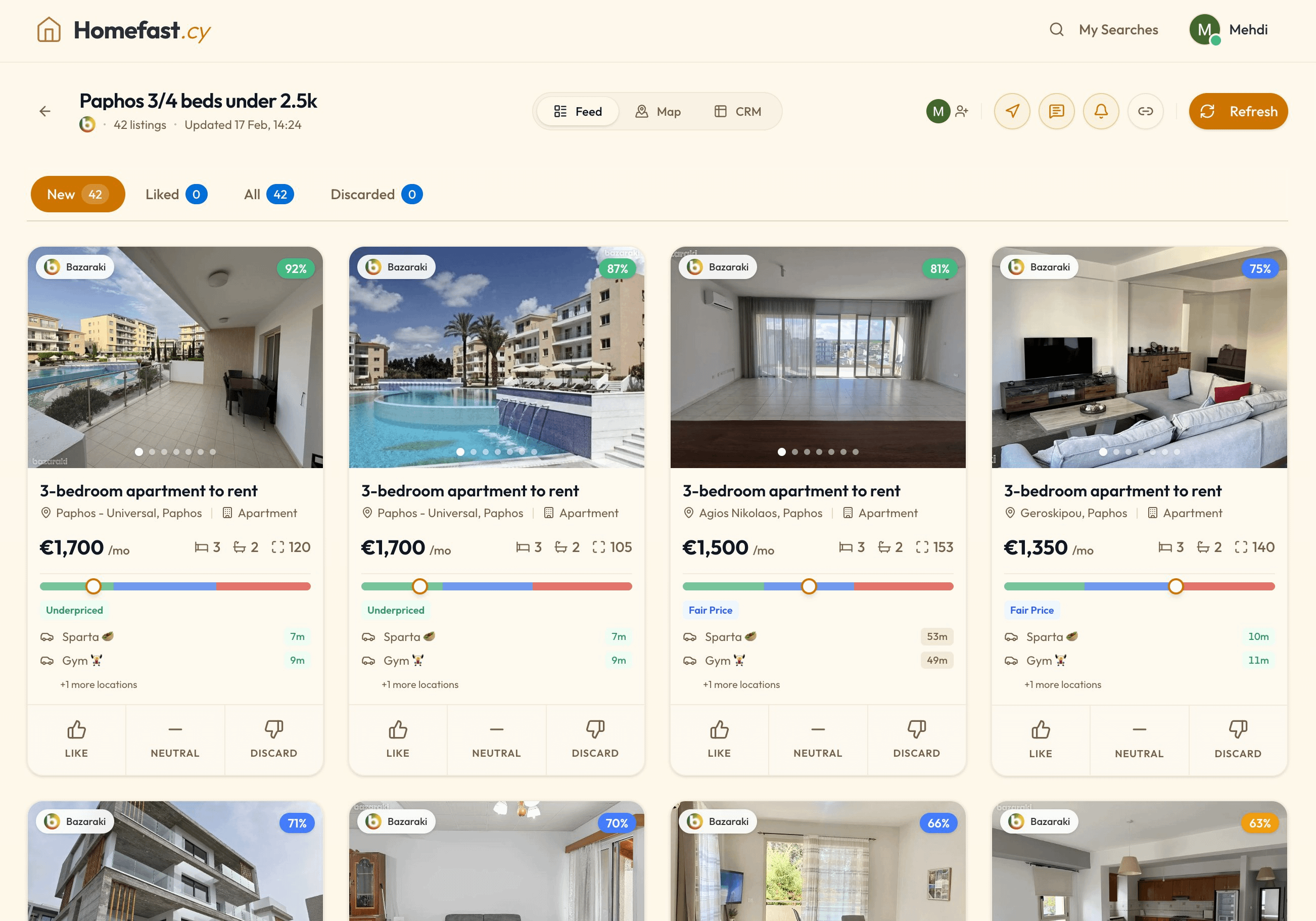 Ich wollte einem Umzugsunternehmen nicht 2.000 € zahlen, nur um einen guten Überblick über den Markt zu bekommen, also habe ich stattdessen Homefast gebaut. Es fasst alle drei Plattformen zusammen (weitere folgen), bewertet Angebote nach Preisgerechtigkeit, zeigt Pendelzeiten an und benachrichtigt Sie, wenn etwas, das Ihren Kriterien entspricht, online geht.