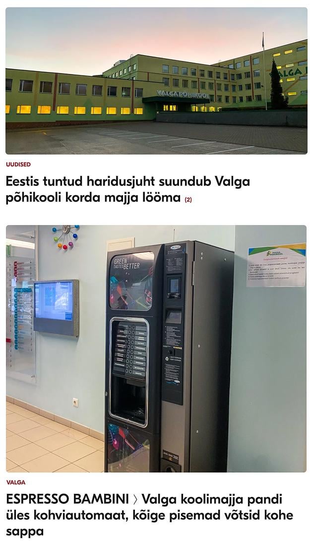 "In der letzten Woche kamen Grundschüler aus Valga von der Schule nach Hause und baten ihre Eltern um Geld, um in der Schule Kaffee zu kaufen. Es stellte sich heraus, dass die Bildungseinrichtung eine Kaffeemaschine installiert hat, die sowohl Espresso als auch Cappuccino anbietet."