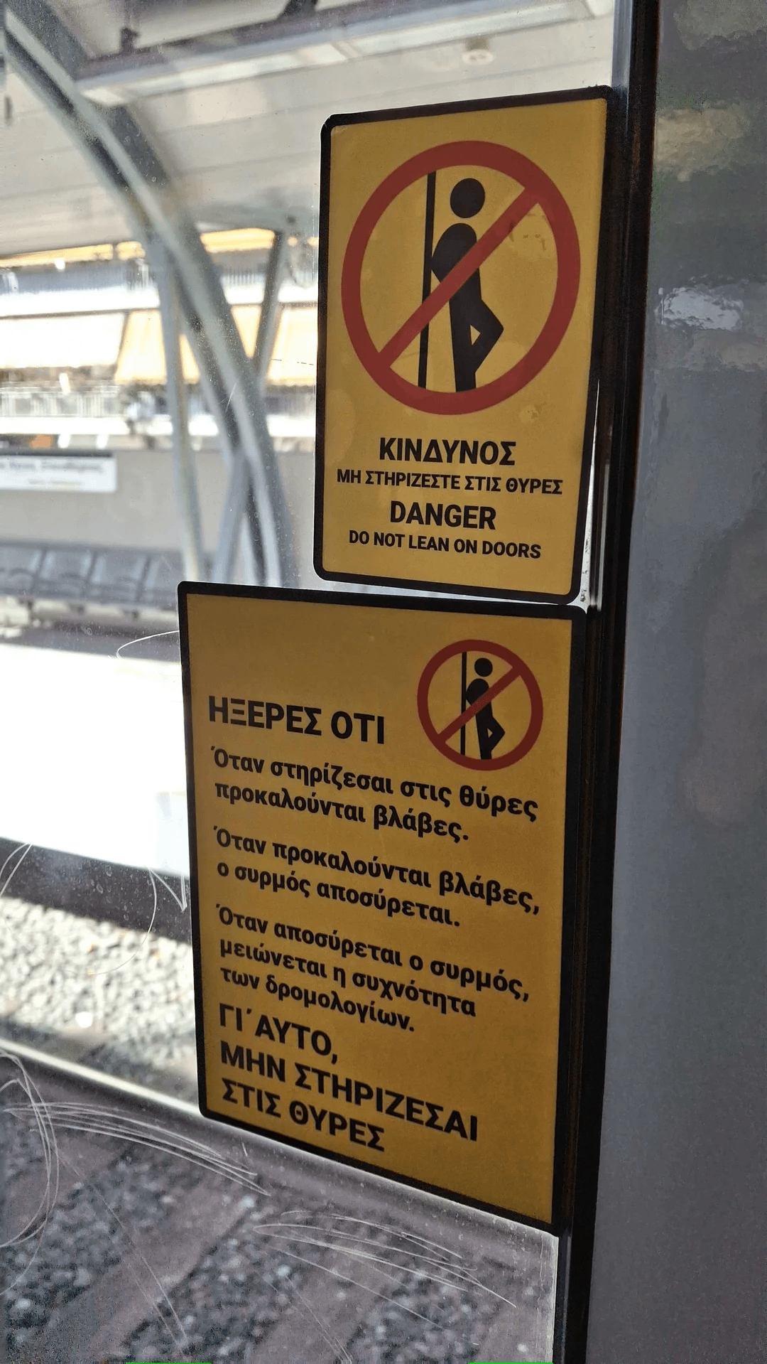 Ώστε γι αυτό έχουμε τέτοια δρομολόγια και τόση ασφάλεια στα τρένα, φταίνε οι πολίτες που στηρίζονται στις θύρες, έτσι εξηγείται. Έχει γίνει μάστιγα αυτό το πράγμα και δεν προλαβαίνουν να τα φτιάχνουν! (Είναι καλό ότι υπάρχει αυτή η σήμανση κινδύνου αλλά είναι και λίγο παρανοϊκό όταν συμβαίνουν όλα τα υπόλοιπα, όπως π.χ. ότι ακόμα 3 χρόνια μετά το τραγικό δυστύχημα ακόμα δεν έχουμε ασφαλή τρένα)