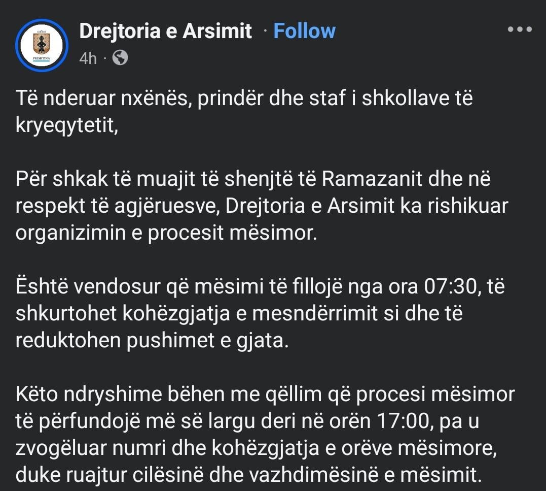 2. Un personalisht nuk agjeroj, as kurr nuk kom agjeru, po e respektoj shumicen qe agjeron, edhe nuk shoh problem. Cka ka lidhje qe u shty pak orari e nxansave, ose pse duhet me u kon problem? Ka shume prind qe i marrin fmite e tyne prej shkollave, edhe duhet me ngajt me i bo krejt senet. Bile shume mire qe ja kan nis pak me menu per qytetart.