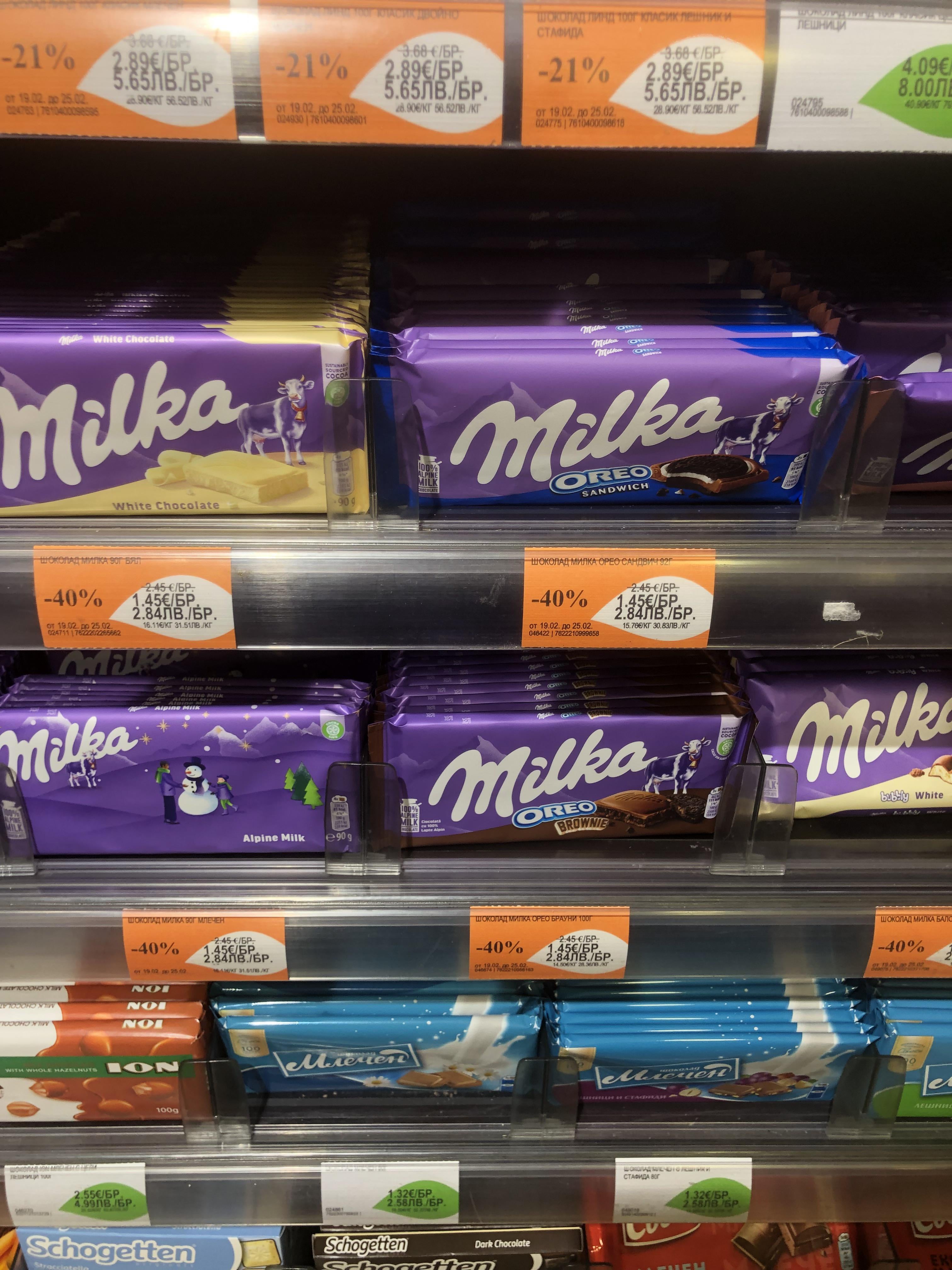2. Милката на много места е 2.50 евро за малката опаковка и това е от поне година. Периодично я пускат на промоция горе-долу на половин цена или пък редуват – когато искат да продават големите опаковки ги пускат на промоция тях а малките ги оставят на 2.50 и обратно, когато искат да продават малките опаковки