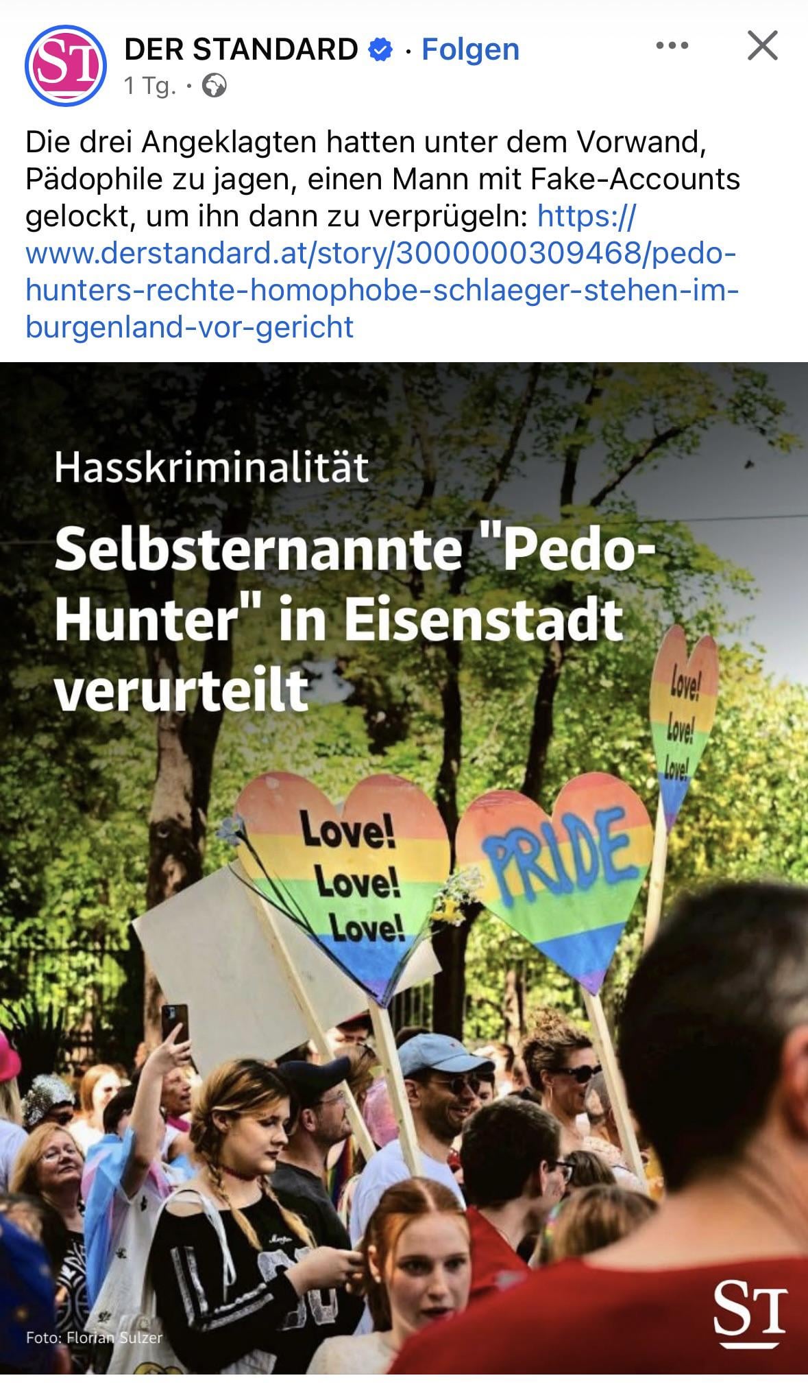 [Link zum Artikel](https://www.derstandard.at/story/3000000309468/pedo-hunters-rechte-homophobe-schlaeger-stehen-im-burgenland-vor-gericht?fbclid=IwdGRleAQHzFlleHRuA2FlbQIxMQBzcnRjBmFwcF9pZAo2NjI4NTY4Mzc5AAEeoa9zUyYv870PBCoOfARD1EKtPxykdt9evsnwvZDon9RMdGPizkdy3chKKNM_aem_YOSV5Rjjh2JE4g_dohDV-A)