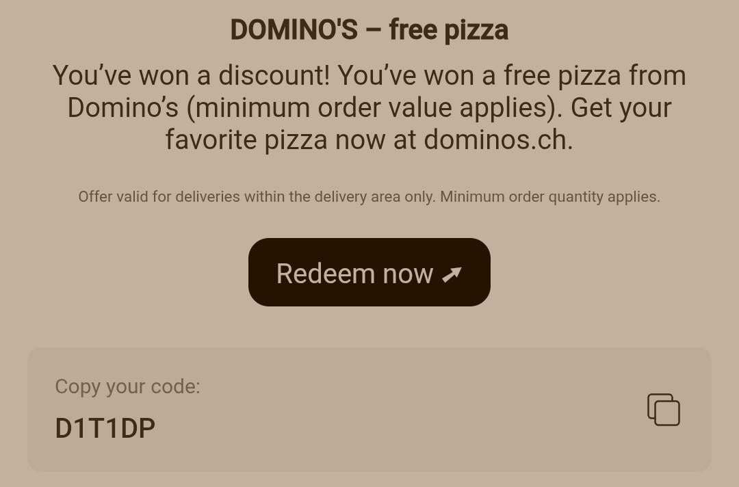 Hallo zusammen, ich habe mit Twint eine kostenlose Pizza für Domino gewonnen und werde sie nicht nutzen. In meiner Region gibt es kein Domino.
