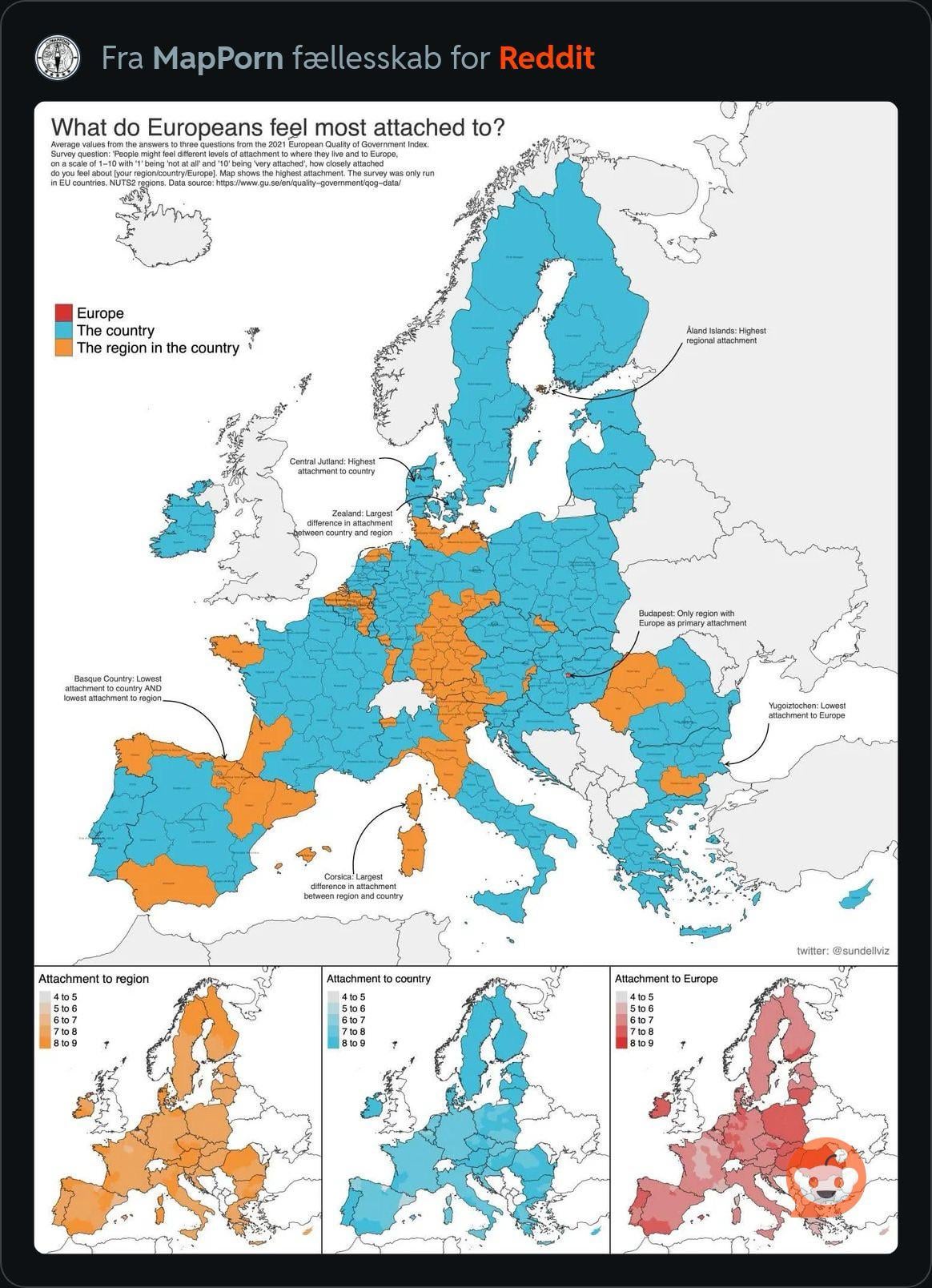 Ich bin gerade auf diese Karte der Verbundenheitsgefühle der Europäer gestoßen. Region, Land und Europa – und Dänemark sticht tatsächlich ganz deutlich hervor.