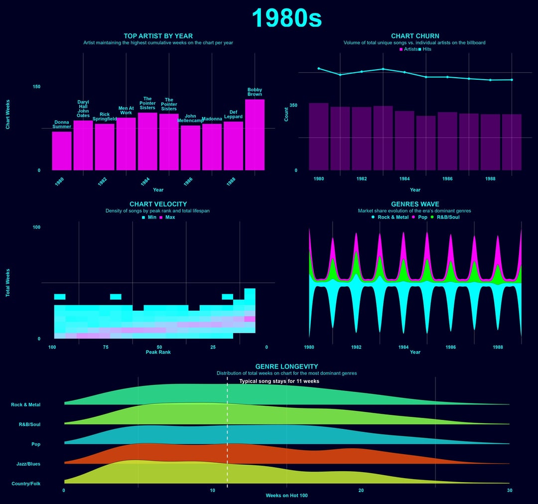I wanted to see how pop culture actually shifts visually, rather than just looking at lists. It took a massive pipeline to clean the genres and map the lifespans of these tracks.