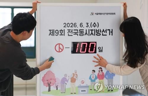 Am 23., 100 Tage vor den Kommunalwahlen am 3. Juni, bringen Mitarbeiter der Seoul Metropolitan Election Commission im Bezirk Jongno, Seoul, Aufkleber an einer Informationstafel an. 23. Februar 2026.