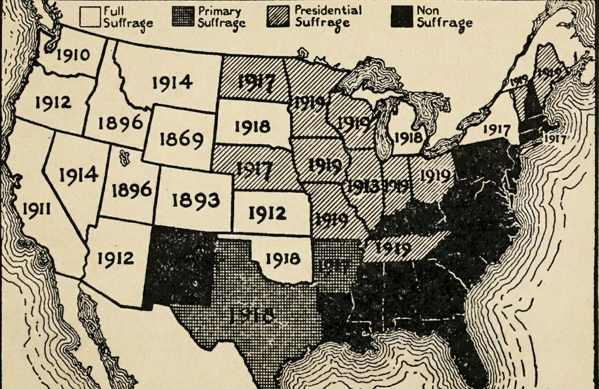 Just a reminder to people that this map only conveys voting suffrage by the 19th amendment, and not other aspects of suffrage, like independent property ownership.
