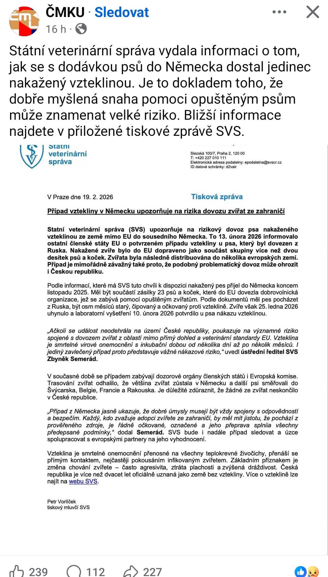 Erst seit 2004 sind wir ein tollwutfreies Land. Nun wurde im Rahmen der Tollwutrettung eine Probe nach Deutschland gebracht. Ist es notwendig, jedes Tier zu retten? Damit sich die Tollwut nicht wie die Afrikanische Schweinepest in unseren ländlichen Gebieten ausbreitet. Schließlich beschützen wir hier gerne Fuchsträger, und wir haben Wölfe pro Quadratkilometer wie Kanada.