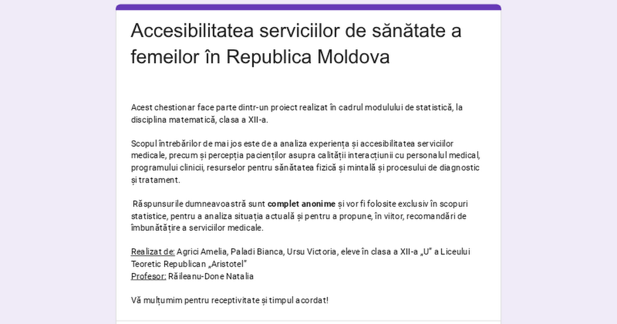 Chestionar despre accesibilitatea serviciilor medicale pentru femeile din Republica Moldova.