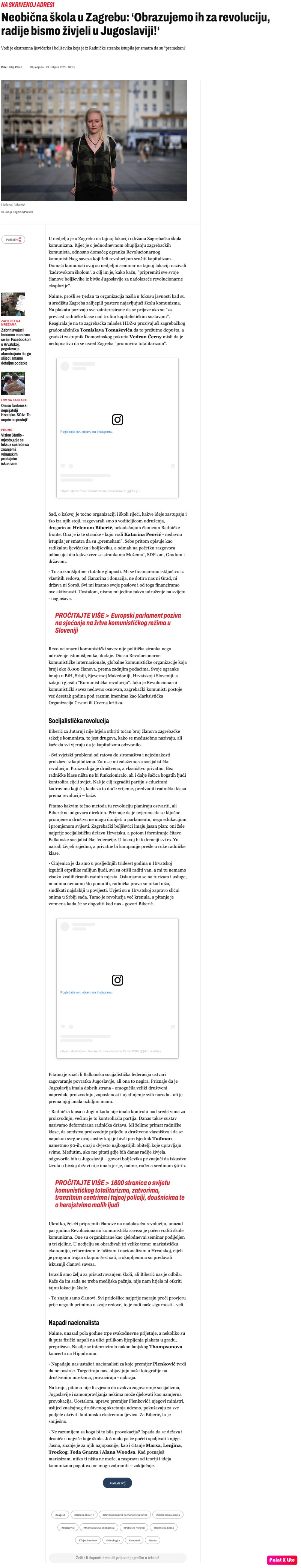 1. > U nedjelju je u Zagrebu na tajnoj lokaciji održana Zagrebačka škola komunizma. Riječ je o jednodnevnom okupljanju zagrebačkih komunista, odnosno domaćeg ogranka Revolucionarnog komunističkog saveza koji želi revolucijom srušiti kapitalizam. Domaći komunisti svoj su nedjeljni seminar na tajnoj lokaciji nazivali ‘kadrovskom školom‘, a cilj im je, kako kažu, „pripremiti sve svoje članove boljševike iz bivše Jugoslavije za nadolazeće revolucionarne eksplozije“.