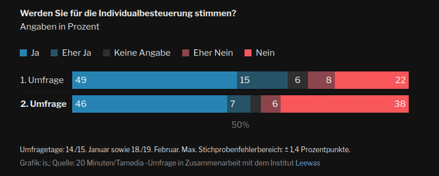 • Die Zustimmung zur Individualbesteuerung ist von 64 auf 53 Prozent gesunken.