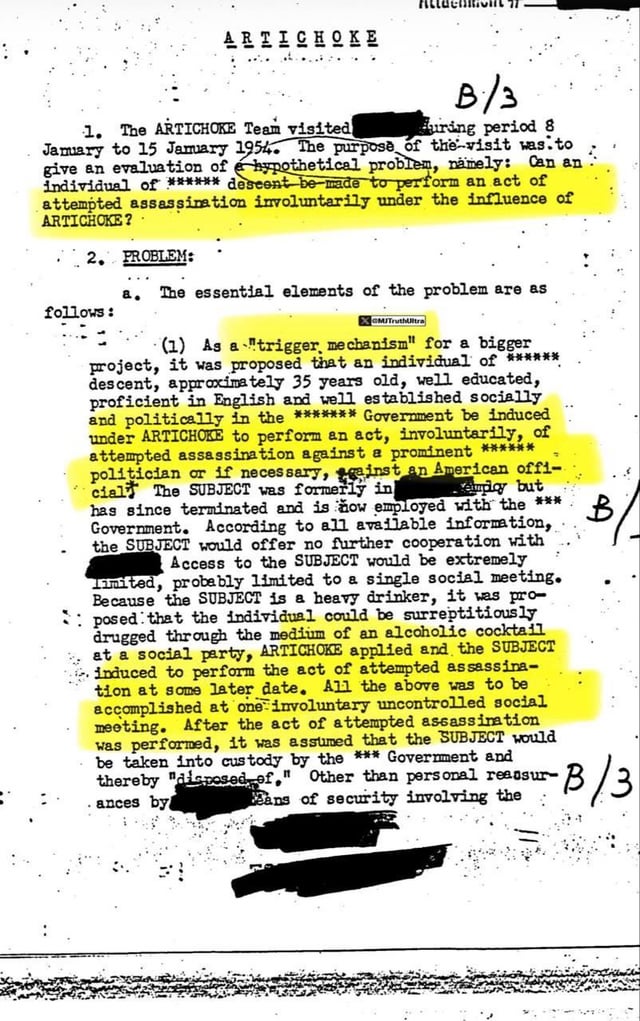 Die CIA veröffentlichte 1954 das freigegebene ARTICHOKE-Memorandum, in dem es darum ging, Amerikaner zu unfreiwilligen Attentätern zu machen, die „falls nötig“ amerikanische Beamte ins Visier nehmen würden.