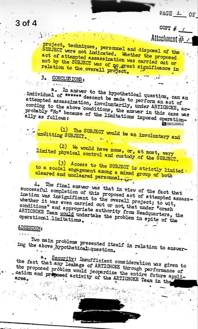 Dieses Dokument des CIA-Projekts ARTICHOKE vom 22. Januar 1954 ist eine Machbarkeitsbewertung der Frage, ob ein Subjekt unfreiwillig – durch eine einzige, unkontrollierte soziale Begegnung – dazu gebracht werden könnte, einen Mordversuch an einem prominenten Politiker mithilfe von ARTICHOKE-Techniken (Drogen, Hypnose usw.) zu unternehmen. Das Memorandum nennt eindeutig ausländische politische Beamte als Hauptziele und schließt amerikanische Beamte als Ersatzoptionen ein.