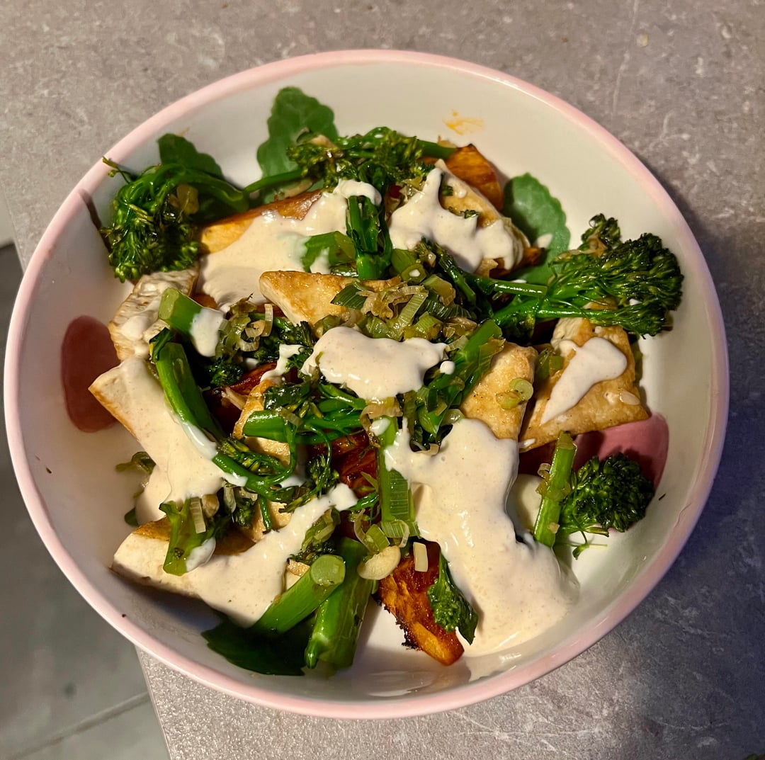 Gochujang Süßkartoffel, Tofu, Brokkolini und Sesamsoße